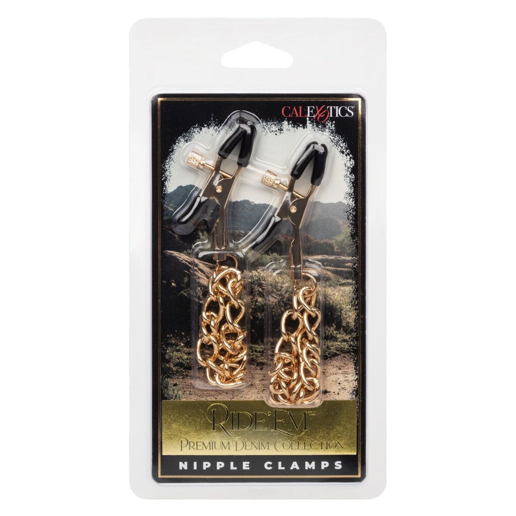 The Ride 'em Premium Denim Collection nipple clamps offer adjustable pressure and soft pads for added sensitivity. The two chains provide a subtle tug that increases arousal. Made with nickel-free materials for safety. Explore new levels of arousal with this stylish and sensual accessory.