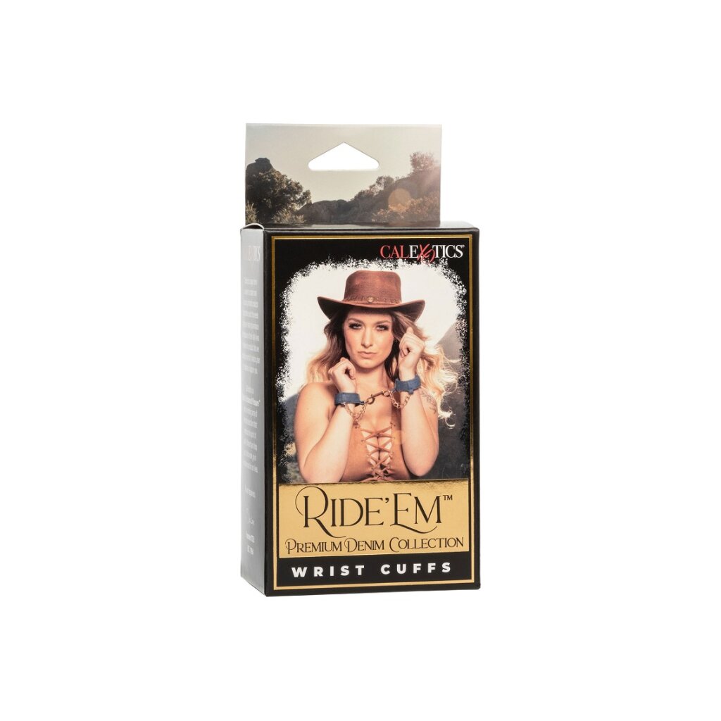 Ride 'em Premium Denim Collection wrist cuffs that combine style, comfort and restraint for BDSM adventures. Adjustable with snap closures for a snug fit, they feature a double-ended clasp for versatility and D-rings for exploration. They are made from soft, durable material and feature sensual designer chains for both comfort and style. Perfect for beginners and enthusiasts alike, these cuffs invite exploration of power dynamics and create unforgettable moments of pleasure and submission.