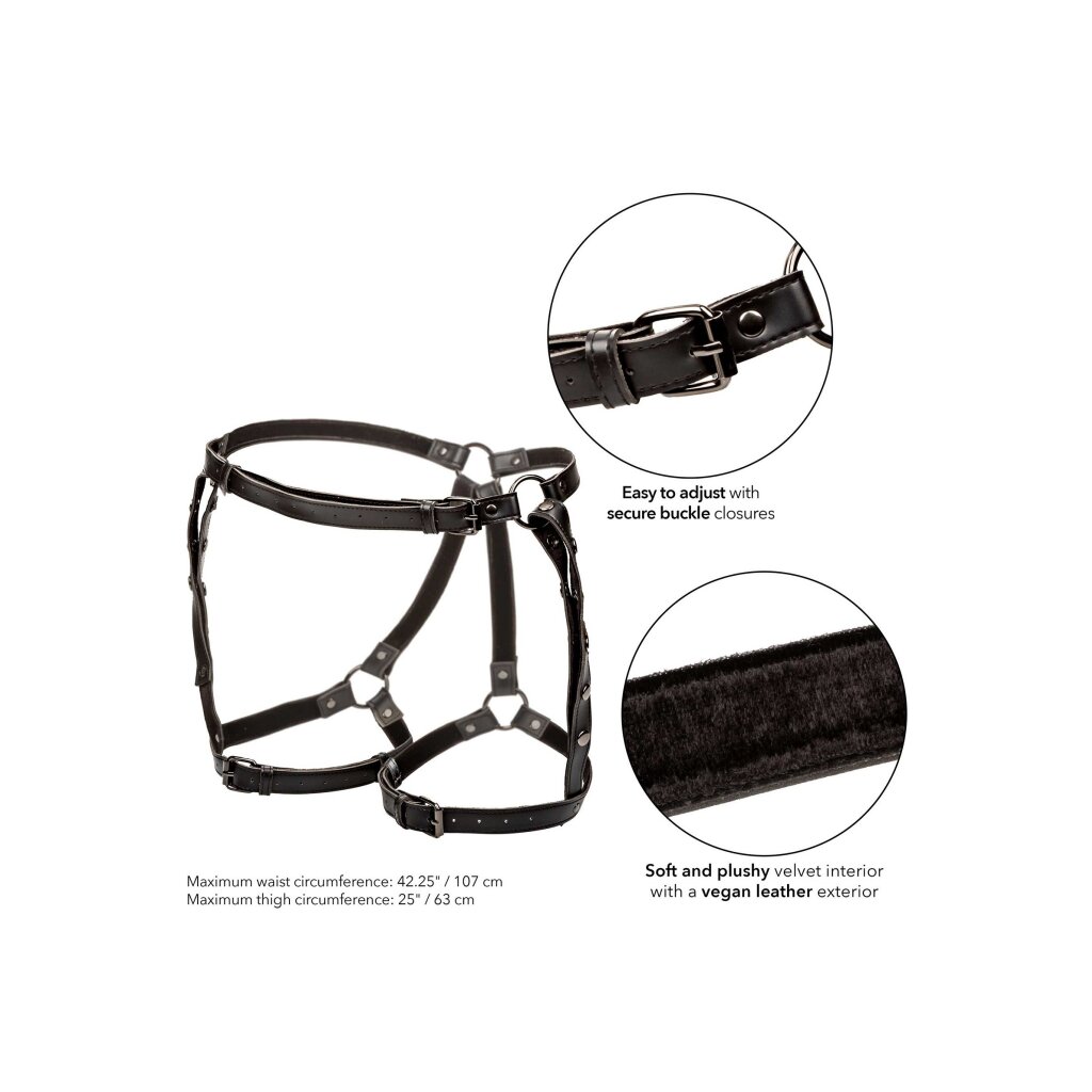 Increase your pleasure with the multi-chain thigh harness from the Euphoria collection, a top-of-the-range accessory for heightened desires. Easy-to-adjust waist and thigh straps ensure a comfortable fit with a simple buckle fastening. The modern design ensures longevity and increases overall satisfaction. Enjoy the luxurious feel of the soft velvet interior and the sophisticated touch of the vegetable leather exterior. The robust construction with double padding and stitching ensures comfort during passionate encounters. The non-dulling metallic accents add glamour and make it a seductive object. Thanks to its versatile design, it fits most standard sizes. Unleash your desire and discover new levels of excitement with the multi-chain thigh harness from the Euphoria collection.