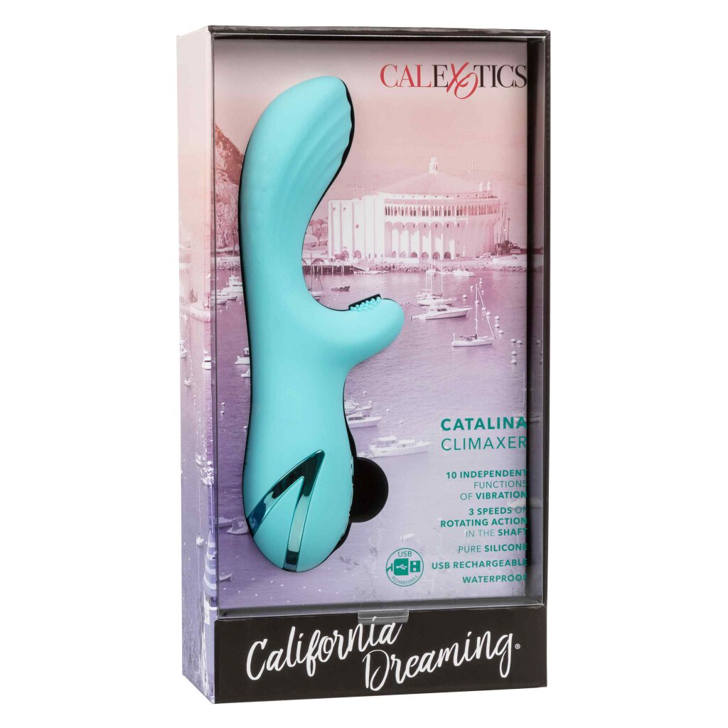 Plongez dans un océan de plaisir et de fantasmes ensoleillés avec le ludique California Dreaming® Catalina Climaxer. Ce luxueux masseur en forme de lapin dispose de 10 fonctions de vibration intense et de 3 vitesses de rotation de la tige pour une sensation de plaisir unique. Le corps en silicone sans couture et le teaser texturé assurent une stimulation qui fait trembler les genoux dans l'eau et hors de l'eau - que vous souhaitiez faire monter la température avec un amant ou simplement profiter de quelques heures sensuelles en solo, ce ravissant masseur est prêt. Tandis que la tige courbée vous gâte avec une puissante stimulation du point G, le stimulateur clitoridien doux et structuré vous procure un délicieux plaisir extérieur. Le câble de chargement USB fourni vous permet de recharger le masseur en 2,5 heures pour une stimulation à grande vitesse pendant 45 minutes ou une stimulation à vibrations lentes pendant 2,5 heures. Le panneau de commande à trois boutons et le verrouillage de sécurité permettent d'utiliser facilement l'appareil, même en voyage. Grâce à son boîtier pratiquement sans soudure et à sa prise de charge à fermeture automatique, vous pouvez également utiliser ce vibromasseur polyvalent et étanche pour l'immersion. Le silicone hypoallergénique de première qualité est compatible avec le corps, non parfumé et sans phtalates, pour que tes parties les plus sensibles restent heureuses et en bonne santé. Longueur totale : 20.3 cm / Diamètre : tige : 3.75 cm - Stimulateur : 2 cm / Longueur d'insertion : tige : 3.75 cm - Stimulateur : 2 cm / 10 modes de vibration / 3 modes de vitesse / Résistant à l'eau / Matériel : silicone - plastique ABS - revêtement métallique / Rechargeable par câble USB