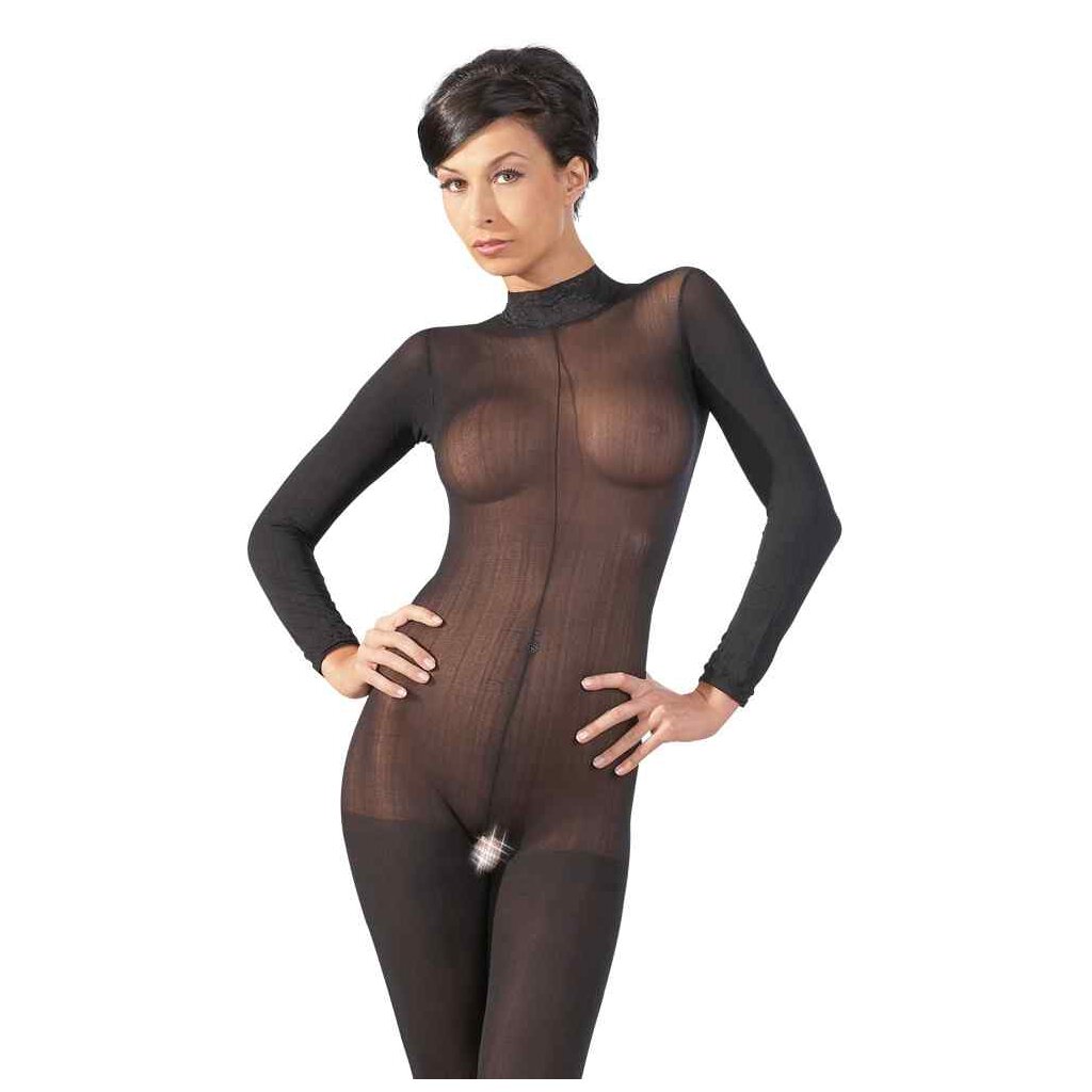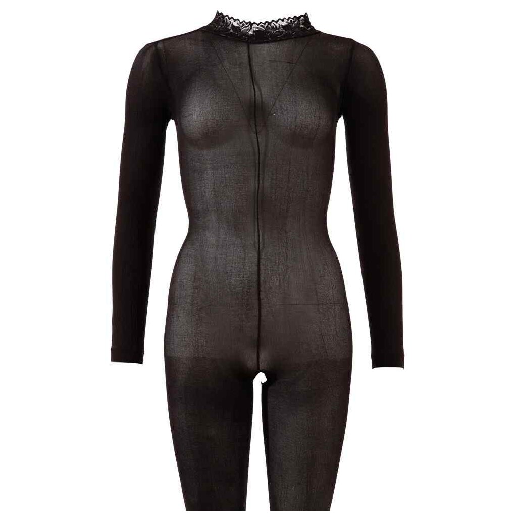 Long-sleeved catsuit made of semi-transparent power net fabric. Crotchless and with a lace collar. With foot part. Soft and light. 100% polyamide.