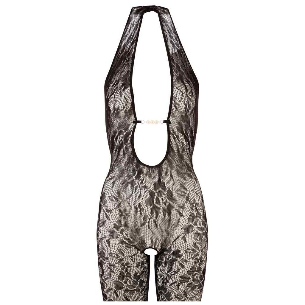 Combinaison noire en tissu filet délicat. Avec un dos nu et trois perles dans la zone du décolleté. Sans entrejambe. Avec partie pieds. 100% polyamide.