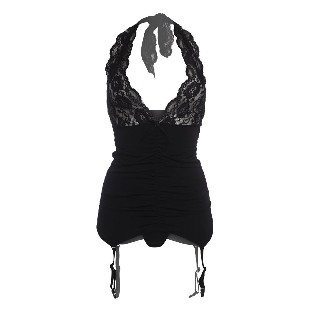 Set bestehend aus einem Straps-Top und einem G-String. Neckholder-Top mit elastischem Body, Spitzen-Cups, gesmokten Seiten und abnehmbaren Strapshaltern. Stringtanga aus Spitze mit Baumwollzwickel.