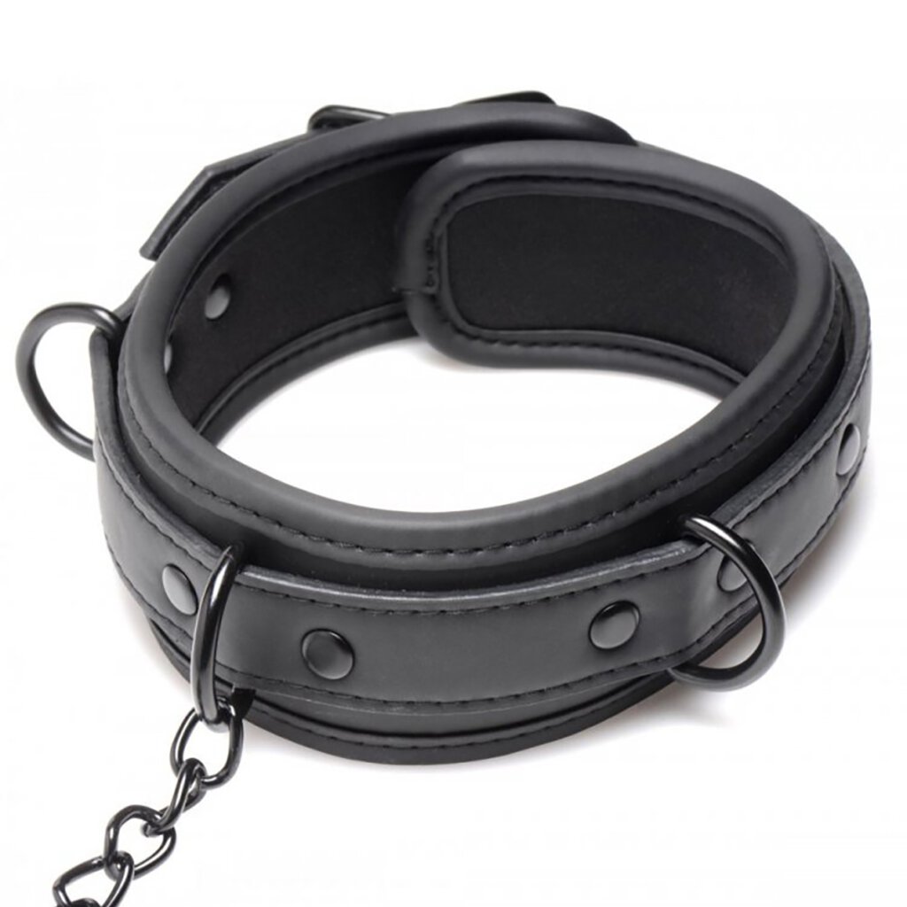 Have your lover kneel in front of you as you place their collar around their neck. The buckles clasp and you make sure the collar fits snug and comfortably so they can feel the gentle, padded and smooth texture of the neoprene. You take the chain at the center of their throat and pull them gently towards you, making them lift their chest. Taking their nipple in your free hand, you take the clamp and place it slowly behind the nipple, on the areola, and adjust the pressure using the small screw. Doing the same on the other nipple, you hear your lover’s breath catch in their throat and gasp as they begin to mingle pain and pleasure, experiencing it all at your hands.
