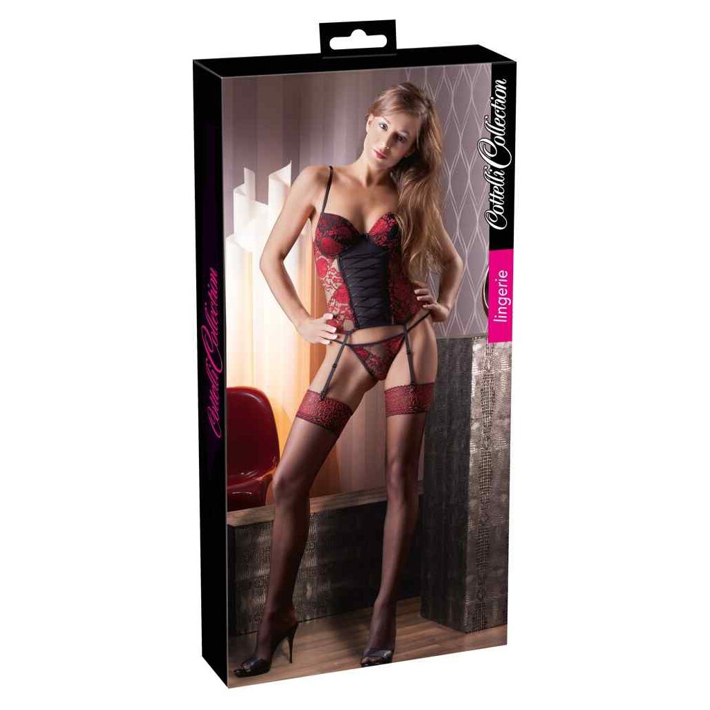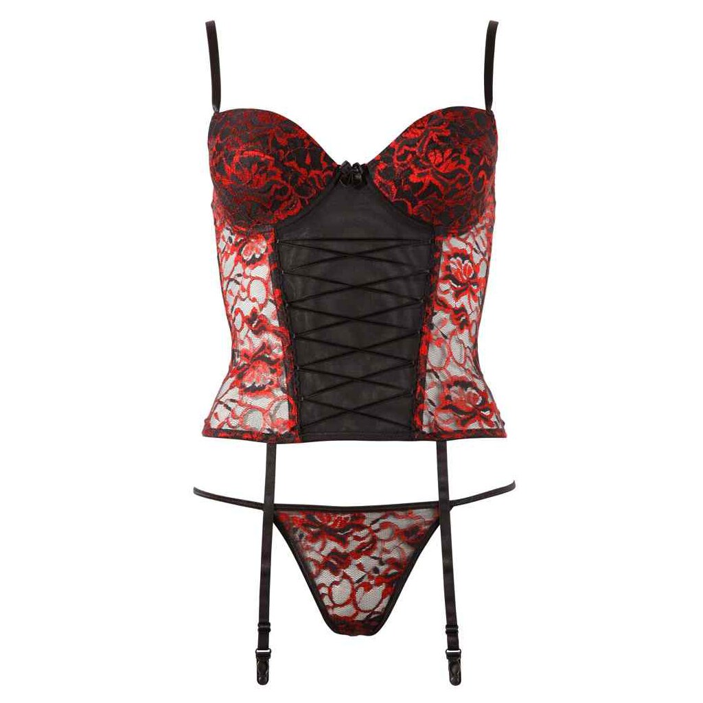 Suspendu corsage avec de la dentelle en deux couleurs. Avec des os et des bonnets légèrement rembourrés et armaturés, et des os de mise en forme. Un laçage décoratif sur le devant. Une fermeture à crochets à l'arrière. Les bretelles du soutien-gorge et des jarretelles sont réglables. Comprend un string assorti avec un gousset en coton. Noir/rouge. 60% polyamide, 35% viscose, 5% spandex. Sans bas.