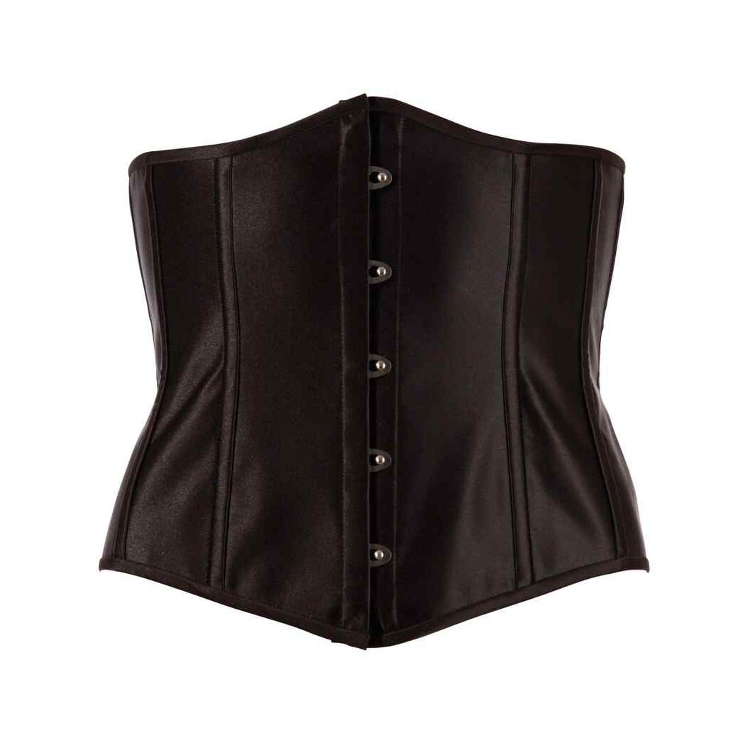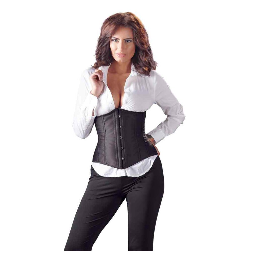 This black, open cup corsage shows off your femininity and gives you a beautiful silhouette, thanks to the 6 bones on each side. The lacing at the back with material underneath it (not suitable for waist reduction) means that the corsage fits your body perfectly. It can easily be opened, thanks to the hook-fasteners at the front. Material: 100% polyester.
