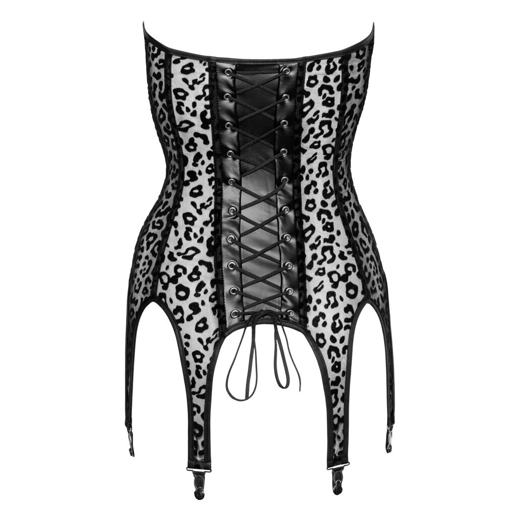 Trägerloses Strapshemdchen von Noir in zarter Transparenz mit feinem Leo-Samt-Flockdruck. Fronteinsatz und Details in edlem matt glänzendem Powernasslook. Der weiche, rundum elastische Materialmix sorgt für hohen Tragekomfort. Die Korsagenform mit dekorativer Schnürung im Rücken und Klettverschluss im Vorderteil betont gekonnt die Silhouette. 6 breite Strapshalter runden den verführerischen Style perfekt ab.