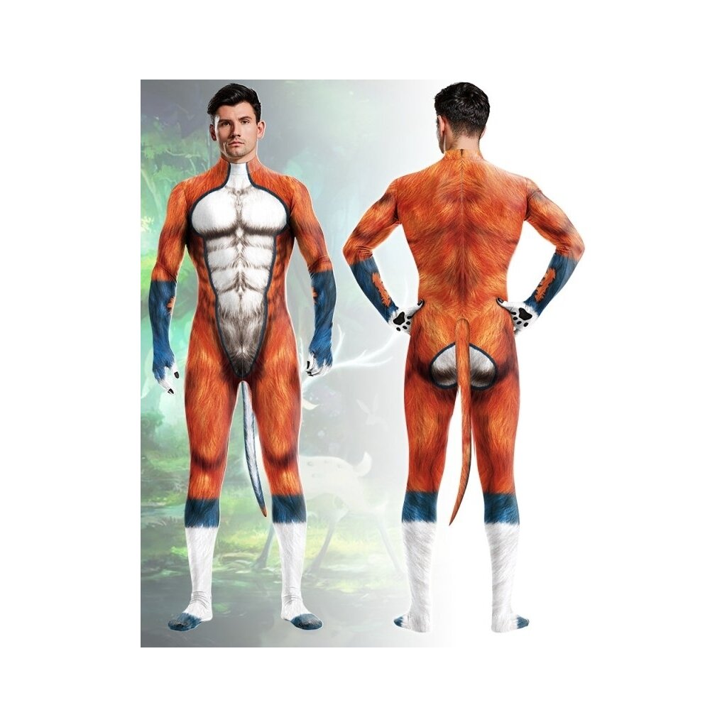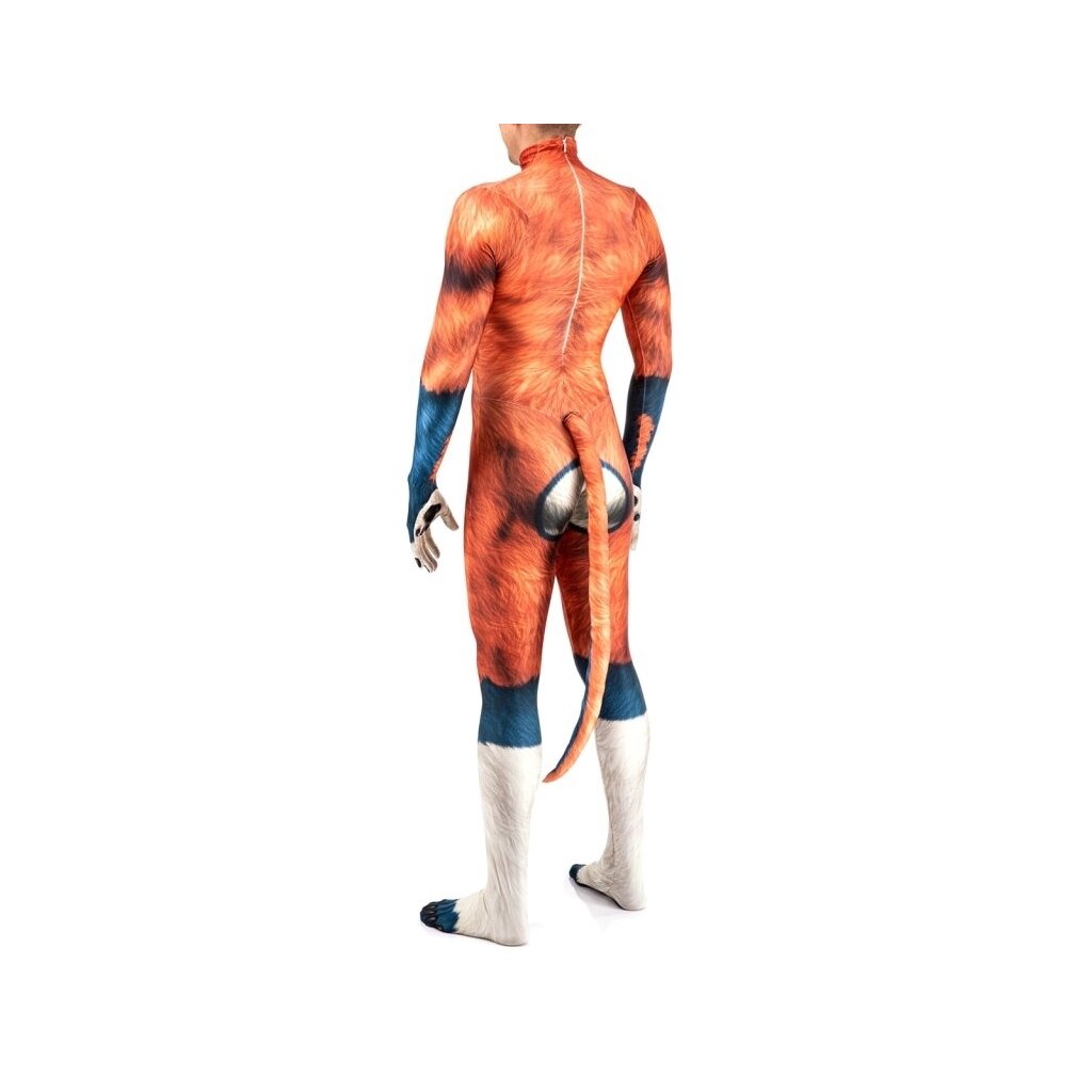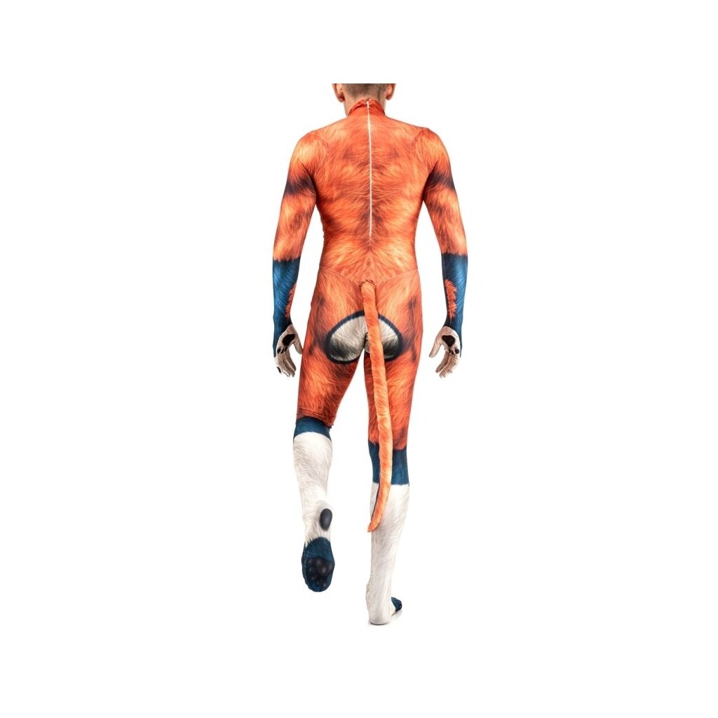 With hair and paw pattern, and long tail.With a full-length zip at the back and a small zip at the front (opposite the sex).