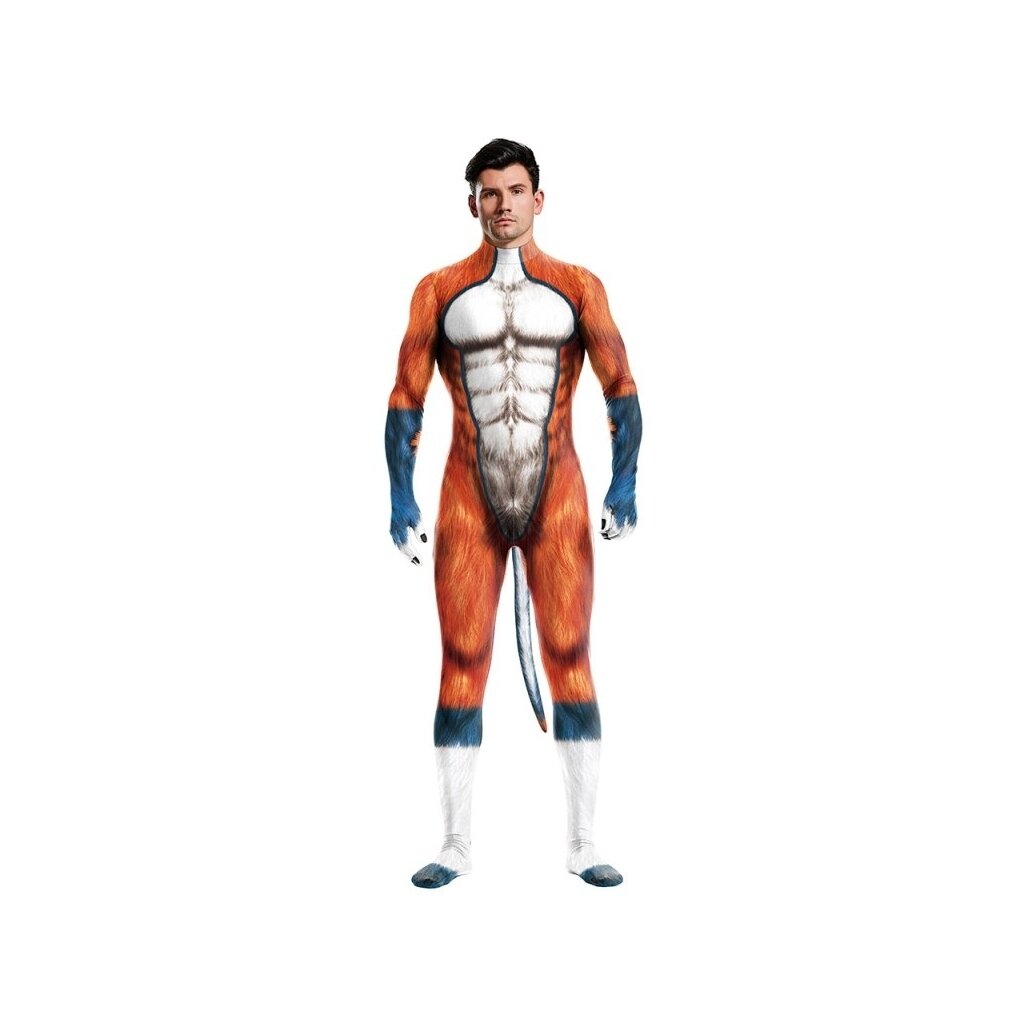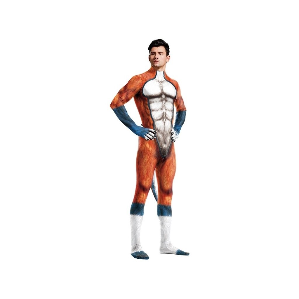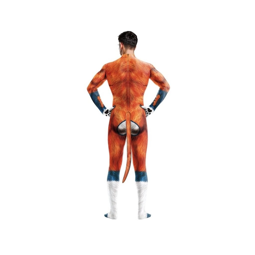 With hair and paw pattern, and long tail.With a full-length zip at the back and a small zip at the front (opposite the sex).