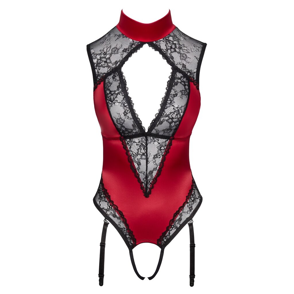 Made from a high-quality material mix of red satin and fine black lace, this suspender bodysuit is soft and stretchy all over for maximum comfort.