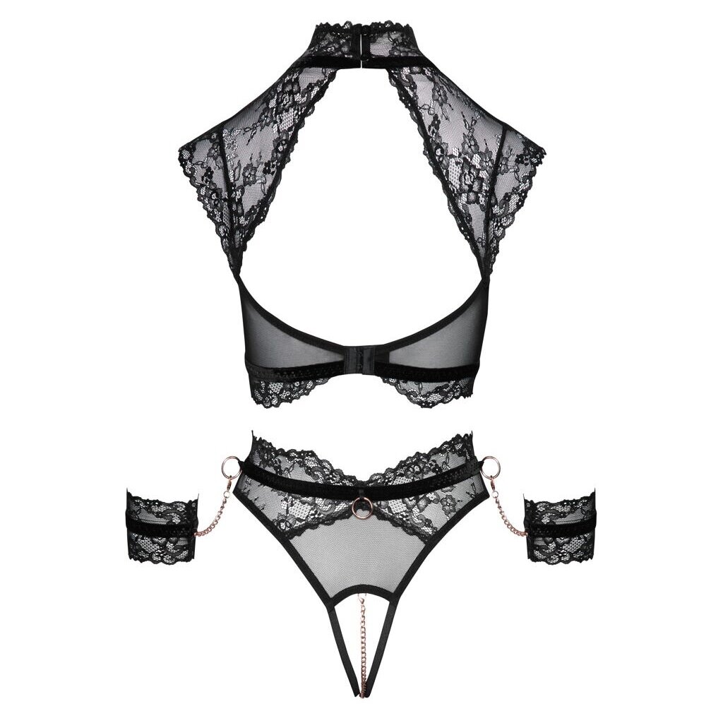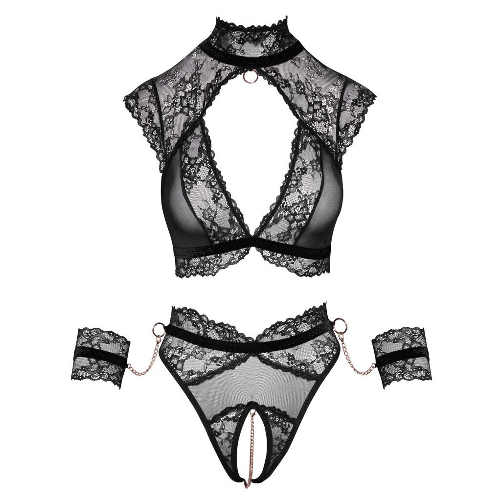 Schwarzes Set von Cottelli BONDAGE mit einem BH, einem Slip im Schritt und zwei weichen Handschellen. Weicher, dehnbarer Materialmix aus feiner Spitze und Powernet mit roségoldfarbenen Accessoires. Schulterbedeckender Soft-BH mit großem Ausschnitt auf der Vorder- und Rückseite. Hoher Spitzen-Stehkragen vorne mit Knöchelring, hinten mit Knöpfen zu schließen. Zusätzlicher Hakenverschluss am Rücken. Hochtaillierter Slip mit abnehmbarer, stimulierender Kette im offenen Schritt. Hinten am Bund und an den Seiten je ein Ring, in den die elastischen Spitzenbündchen mit ihren Karabinerketten eingehakt werden können.