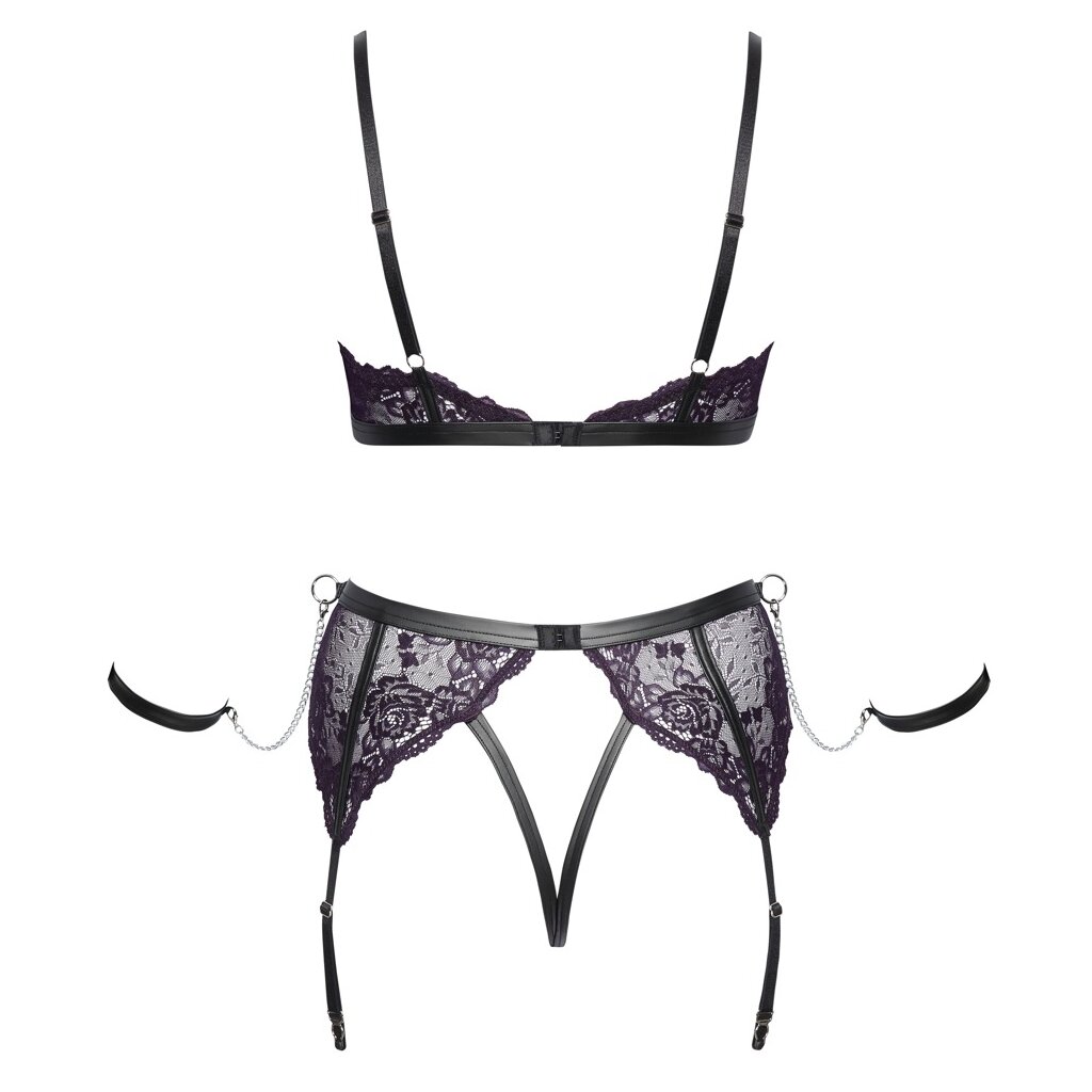 and an open garter thong, will immediately inspire you with its elegant color scheme in dark purple and black. The fine lace combined