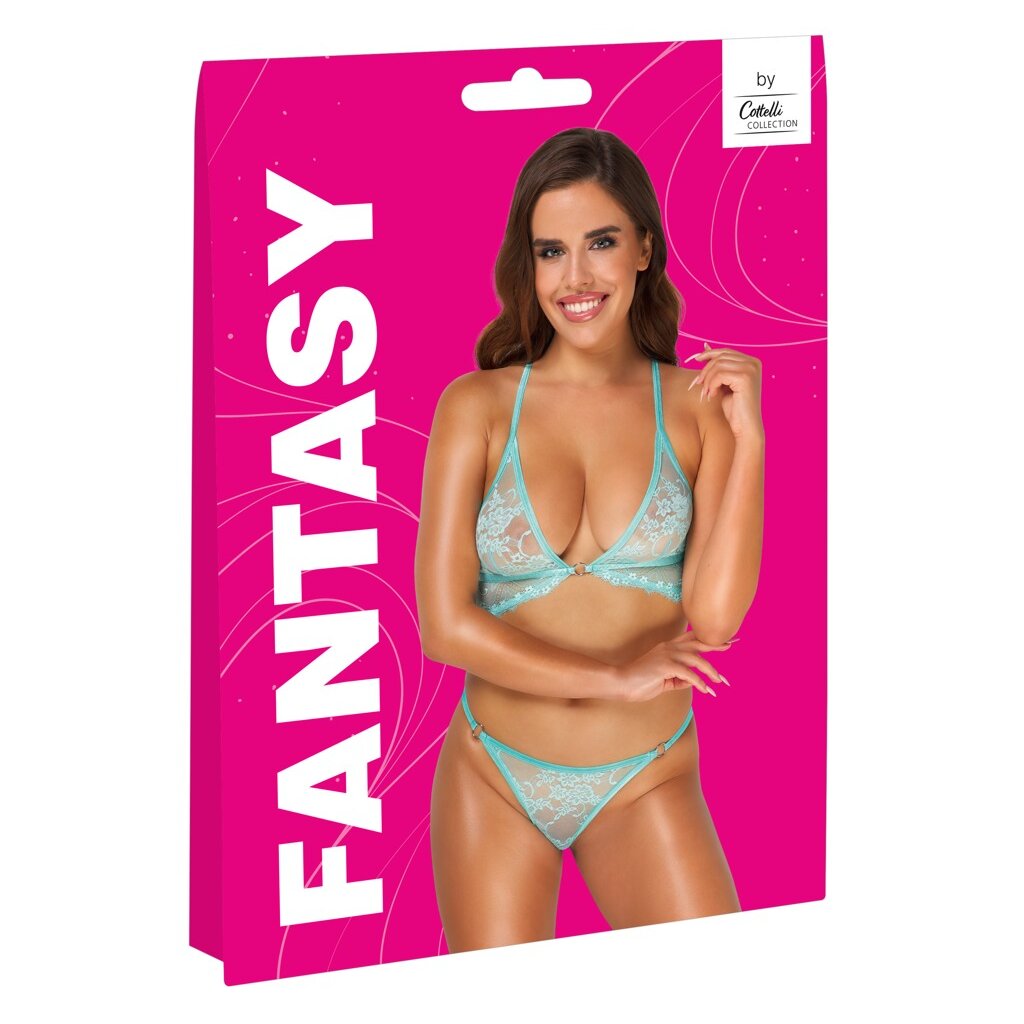 Lingerie-Set von Cottelli FANTASY mit weichem BH und knappen Höschen. Komplett aus zarter, mintfarbener Blumenspitze gefertigt, unter den Cups mit filigraner Wimpernspitze verziert. Rundum weich und elastisch. Silberfarbene Ringe als dekorative Verbindungselemente. Die passenden, verstellbaren BH-Träger kreuzen sich am Rücken.