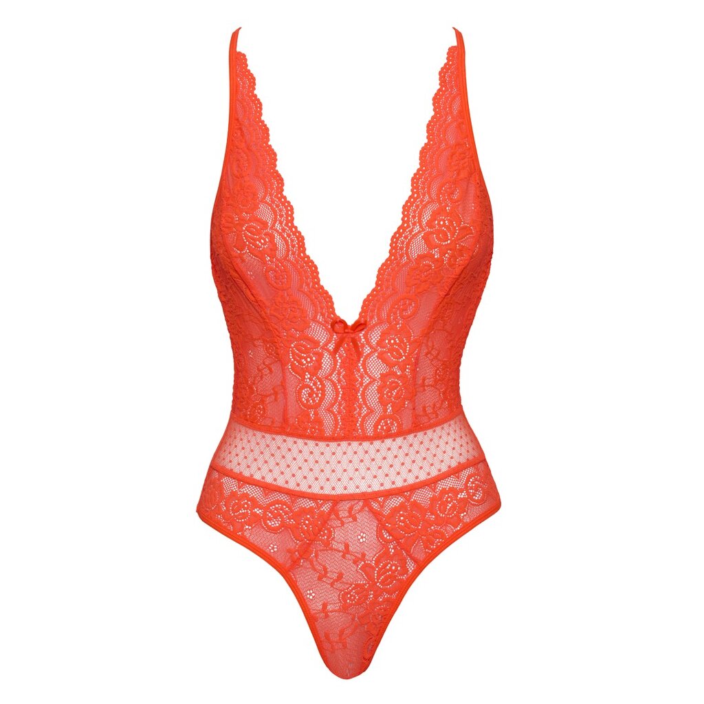 Eye-catching Rio body by Cottelli FANTASY in neon coral. Made from beautiful lace with delicate polka dot tulle at the waist and over the bottom. Soft and elastic all around. Extra deep neckline decorated with a bow. Open back with small hook closure and crossed straps that are adjustable.