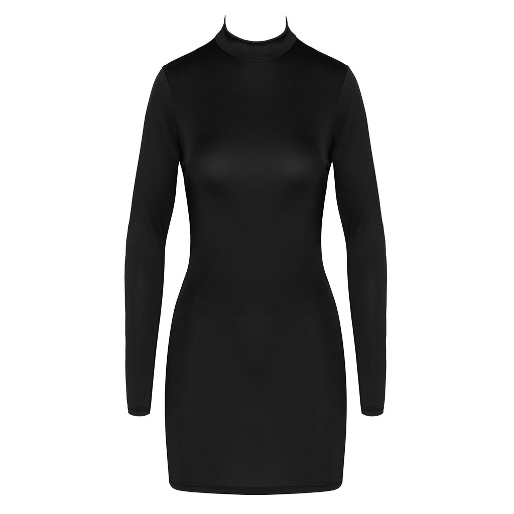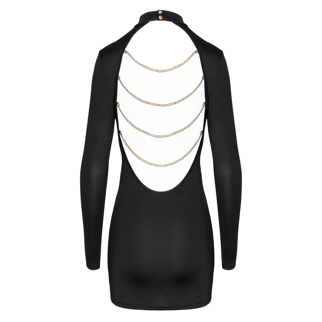 Black mini dress by Cottelli PARTY with a close-fitting cut and long sleeves. Breathtakingly large back neckline with 4 gold-colored chains that can also be removed. The stand-up collar is closed at the neck with 2 gold-colored snap fasteners. The fine stretch material fits softly and ensures maximum comfort and freedom of movement.