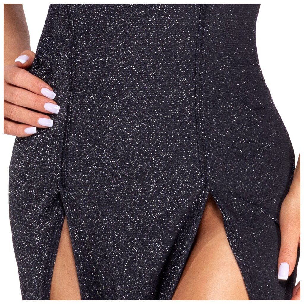 La longue jupe moulante est fendue deux fois à l’avant, offrant une grande liberté de mouvement et beaucoup de sex-appeal. Le tissu élastique à paillettes épouse la silhouette en douceur et assure un confort optimal.