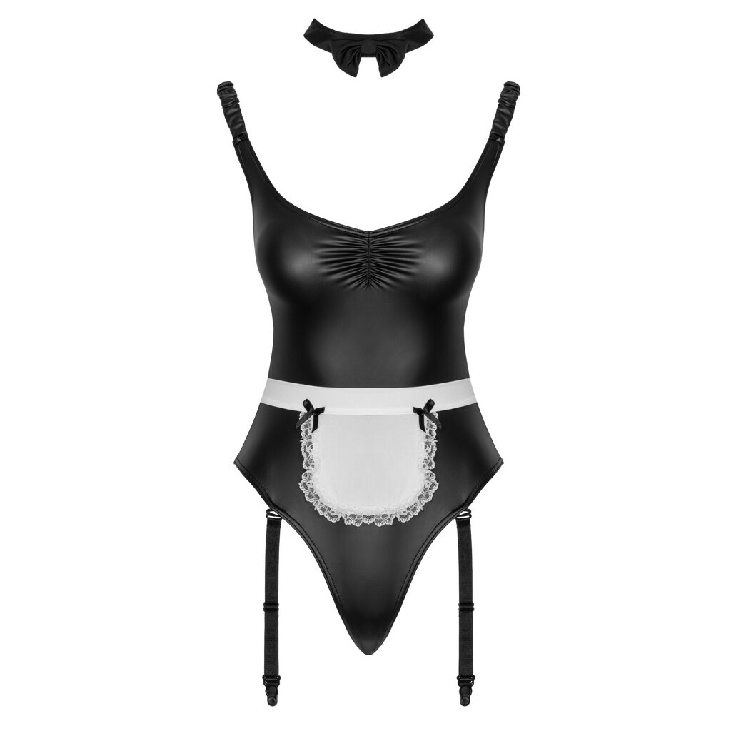 3-piece serving set from Cottelli COSTUMES with suspender bodysuit, apron, and collar. Elastic Rio body in black matte look with deep gathered neckline. The back is also generously cut out. The elastic, fashionably gathered straps can also be worn off the shoulders. High leg cutouts show off the butt and legs to their best advantage. The 4 suspenders are adjustable and can also be completely removed. Collar with bow at the front and adjustable Velcro fastener at the back. The small white apron with lace trim completes the sexy service style.