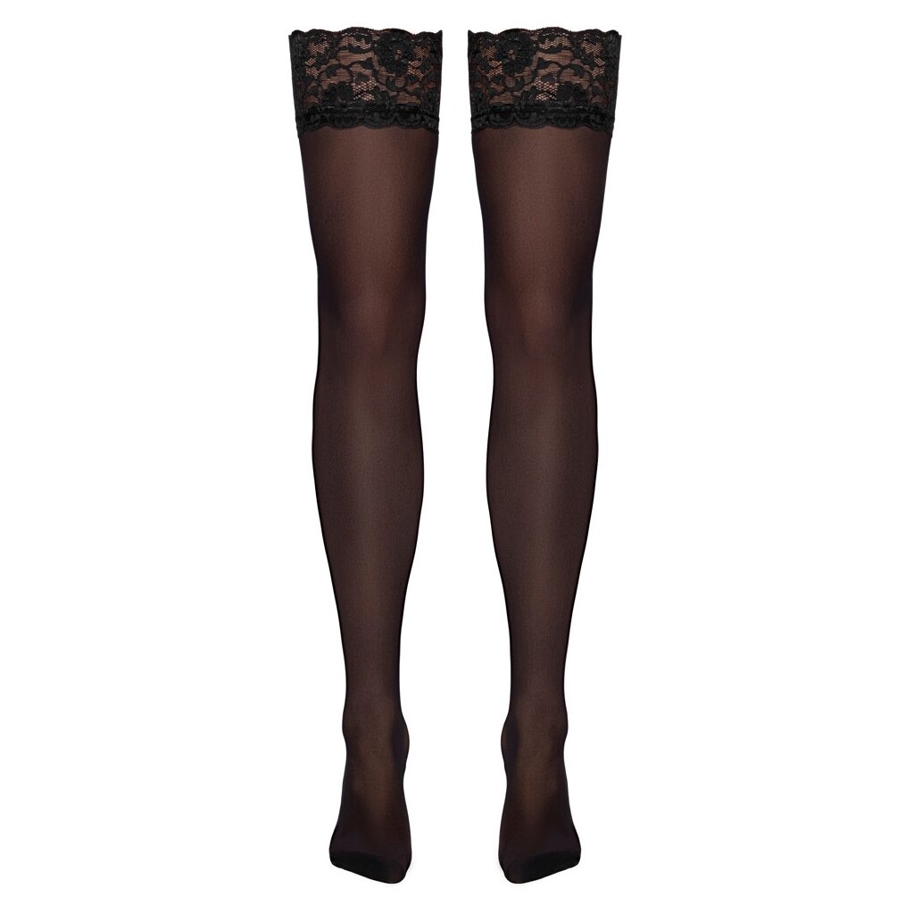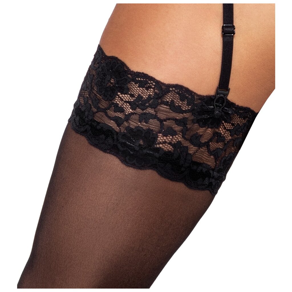 Silky black stockings from Cottelli LEGWARE with 9 cm wide elastic lace trim. Yarn thickness 20 denier. Oeko-Tex certified.