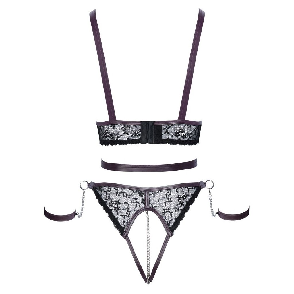 Set von Cottelli BONDAGE mit einem bustless Top, einem Slip im Schritt und zwei weichen Handschellen. Stilvoller Mix aus feiner schwarzer Spitze mit dunkelvioletten Details in Mattoptik und silberfarbenen Accessoires. Das Oberteil umrahmt die nackten Brüste mit Ketten. Der Taillengürtel am vorderen Ring kann mit Druckknöpfen verstellt werden, ebenso die Träger. Verstellbarer Hakenverschluss auf der Rückseite. Slip mit abnehmbarer, stimulierender Kette im offenen Schritt. Verstellbarer Bund mit Druckknöpfen. Die Bündchen können mit ihren Karabinerketten in die seitlichen Ringe am Bund eingehakt werden. Die weichen Knöchelbündchen lassen sich mit den verstellbaren Klettverschlüssen schnell an- und ausziehen.
