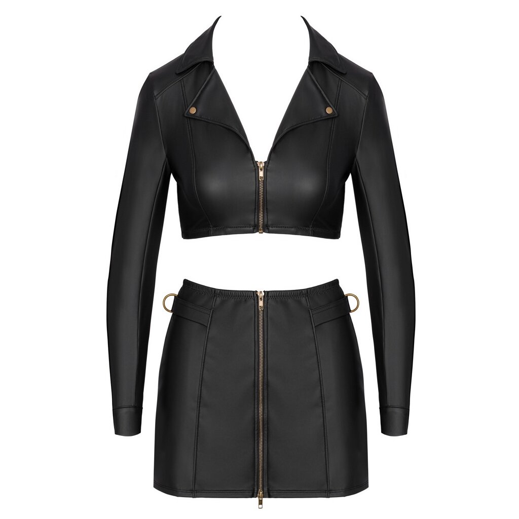 Clubwear de Cottelli PARTY avec un haut court et une mini-jupe au look noir mat avec des détails couleur laiton. Doux et élastique sur tout le pourtour pour un confort optimal. Haut court, veste ajustée avec une fermeture éclair courte sur toute la longueur à l'avant. Clous décoratifs sur le col à revers et boutons-pression aux poignets. La mini-jupe étroite est dotée d'une fermeture éclair double sens sur toute la longueur à l'avant et d'anneaux sur la ceinture élastique sur les côtés.