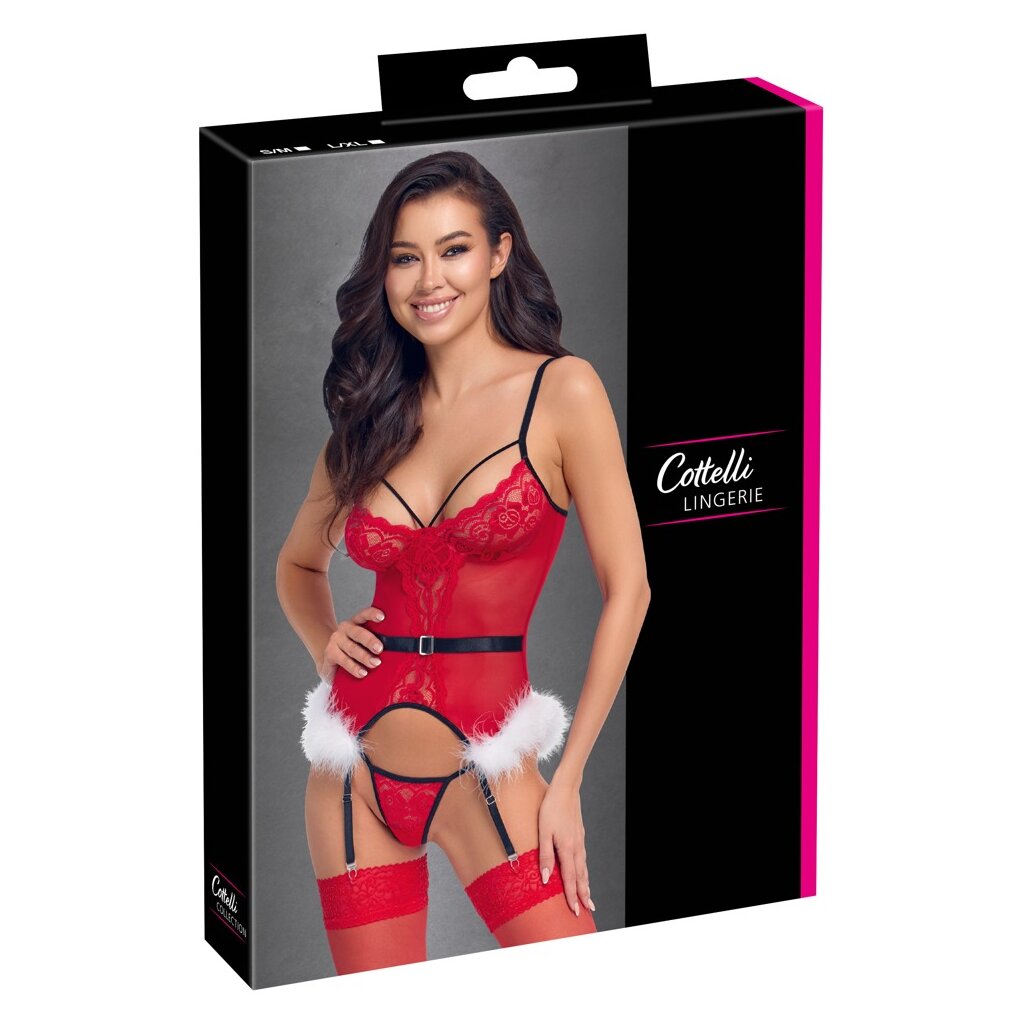 Strapshemd und String im Set X-Mas von Cottelli LINGERIE. Gefertigt aus rotem Powernet und feiner Spitze Ton in Ton, dazu dekorative schwarze Details und ein zarter weißer Federbesatz seitlich an den Hüften.