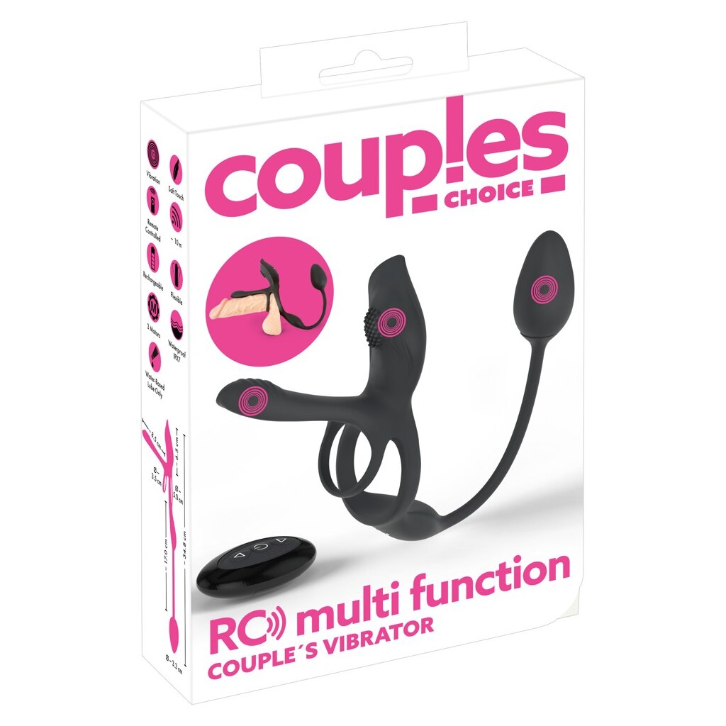 Le RC Multi Function Couple's Vibrator de Coup!es Choice soutient le pénis et dorlote les couples pendant les rapports sexuels grâce à des vibrations profondes. Pas moins de 5 jouets sont combinés dans ce multi-talent : Anneau pour pénis et testicules, vibrateur de couple, vibrateur clitoridien et bouchon vibro-anal.
