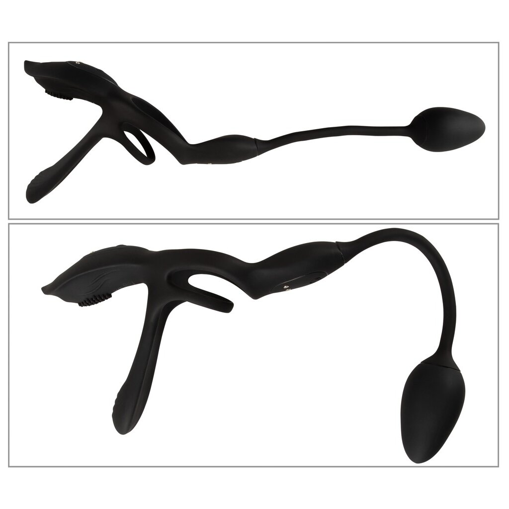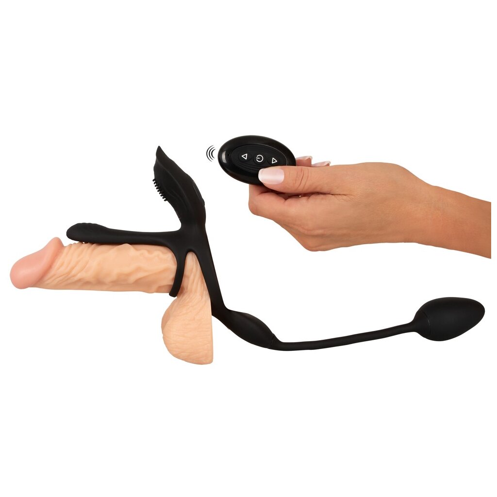 Il est très facile à utiliser : les anneaux de pénis et de testicules sont glissés par-dessus de sorte que le vibrateur plat pour couples s'emboîte sur le pénis. Cela lui permet de profiter d'un pénis plus épais pendant l'acte sexuel et de ressentir lui-même une merveilleuse sensation de tension. L'anneau de pénis soutient également son érection pendant longtemps grâce à l'effet de congestion sanguine. L'anneau pour testicules assure un maintien ferme et sûr et une traction excitante. Le vibrateur clitoridien à picots délicats dorlote le point sensible de la femme pendant l'acte sexuel. Le vibroplug est inséré par voie anale, soit par le porteur, soit pour une stimulation anale supplémentaire du partenaire.
