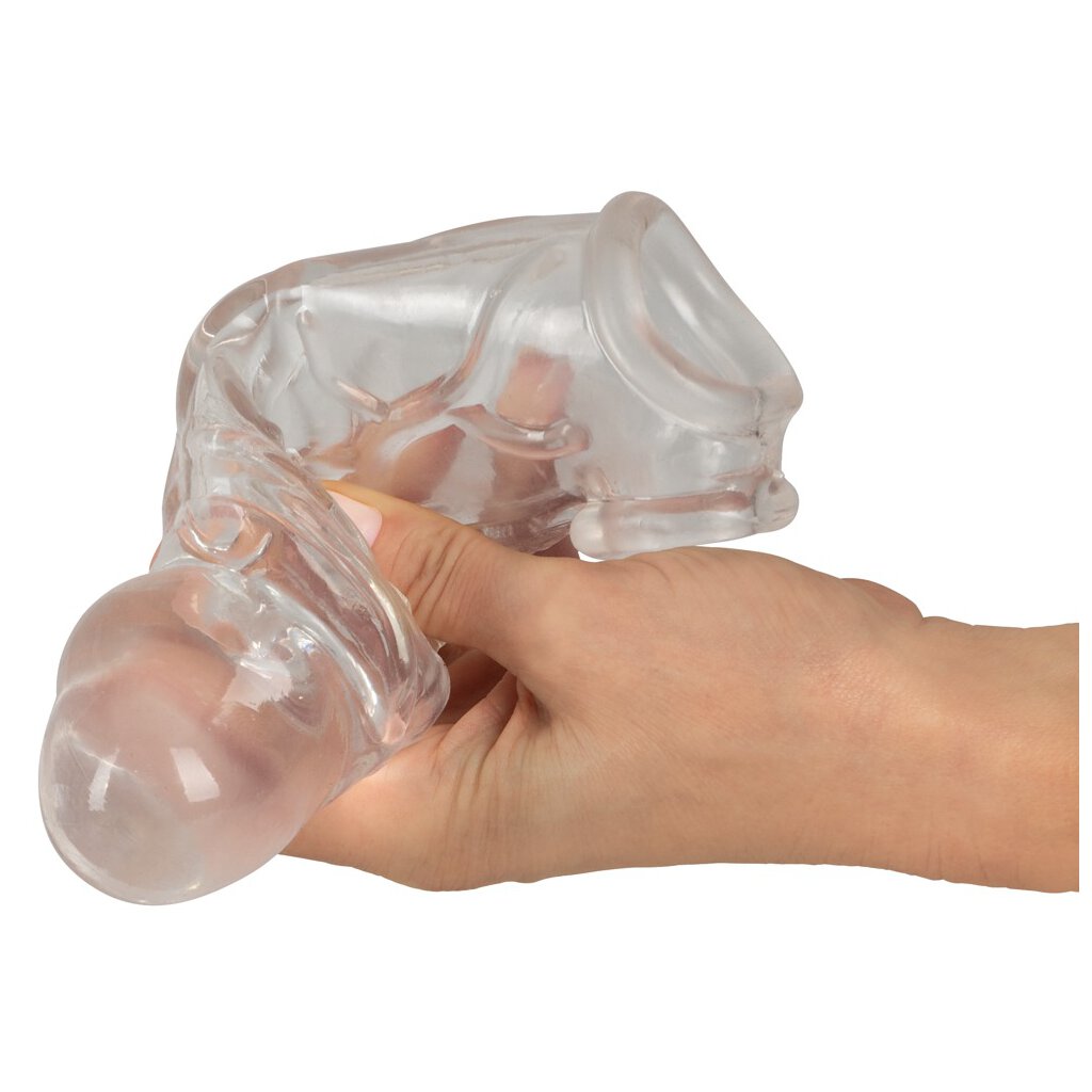 Transparent, distinctly veined penis sleeve with testicle ring Penis Sleeve with extension + ball ring by Crystal Clear gets the penis in top shape for filling moments of pleasure. The tight-fitting, erection-supporting sleeve made from soft stretch material is simply slipped over the erect member. The integrated testicle ring ensures a firm, comfortable fit without slipping off. Thanks to the magnificent outer diameter and material thickness, the penis is significantly enlarged in circumference. And the massive glans extends by 5 cm!