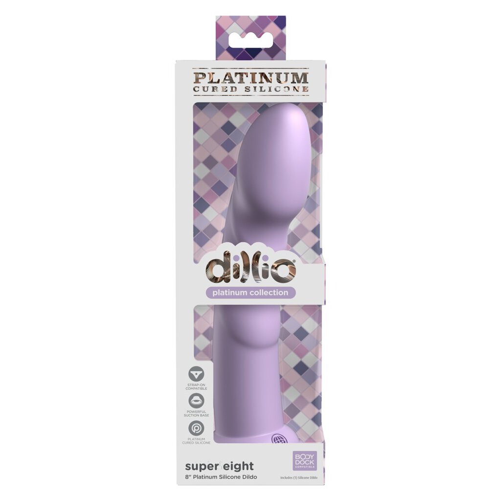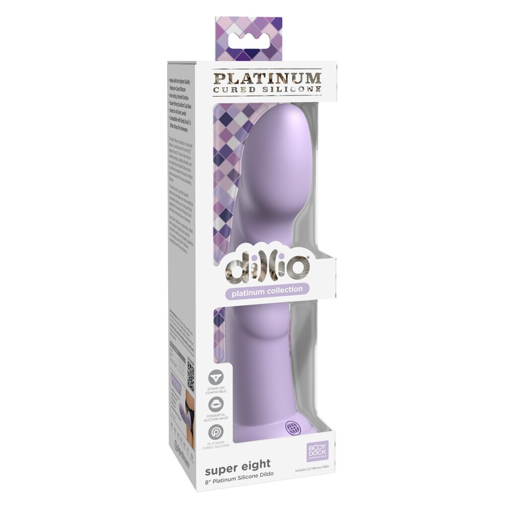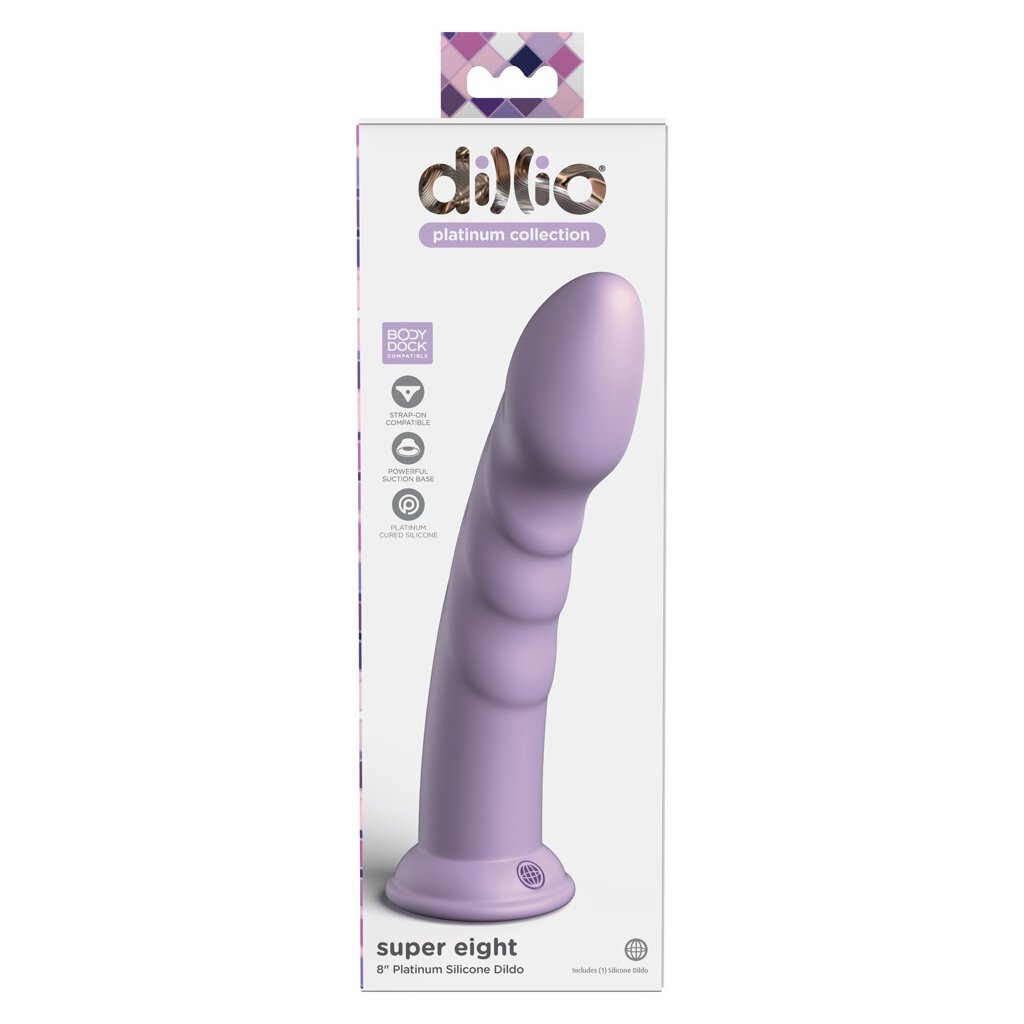 Flexible dildo Super Eight from Dillio Platinum in a simple, beautiful, ideally curved design with pronounced stimulation grooves and indicated glans. With strong suction base that adheres firmly and securely to any smooth surface, allowing for hands-free pleasure. Thus, the dildo is also compatible with strap-ons and urinals.