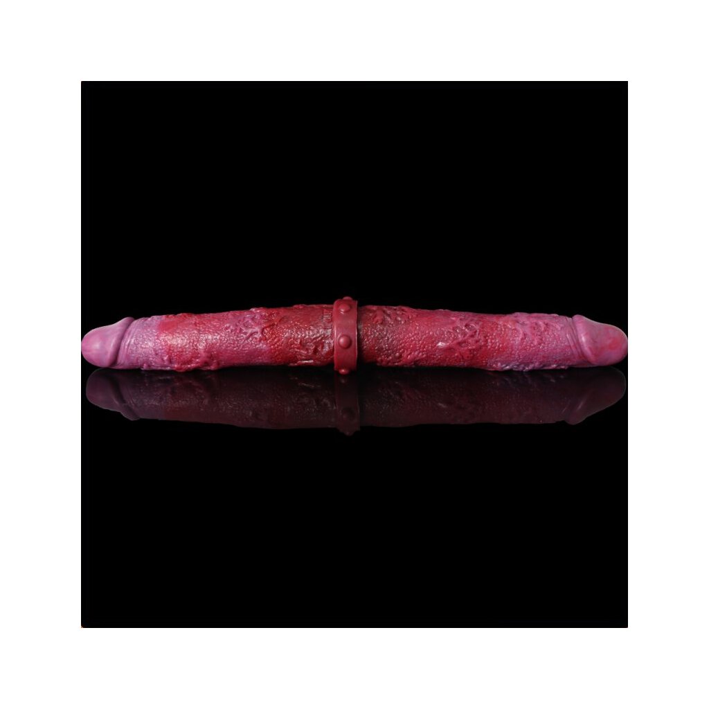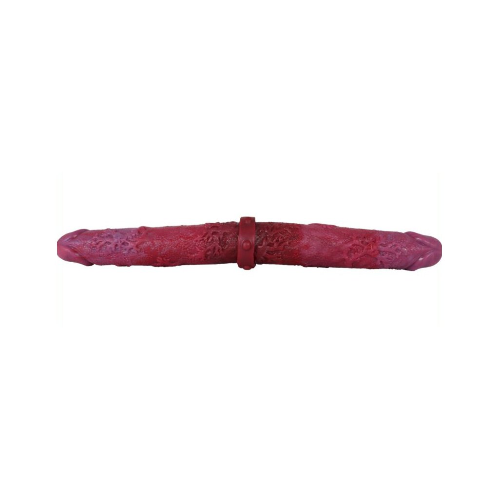 - This double dildo is designed with a dark pink color and a veined surface.