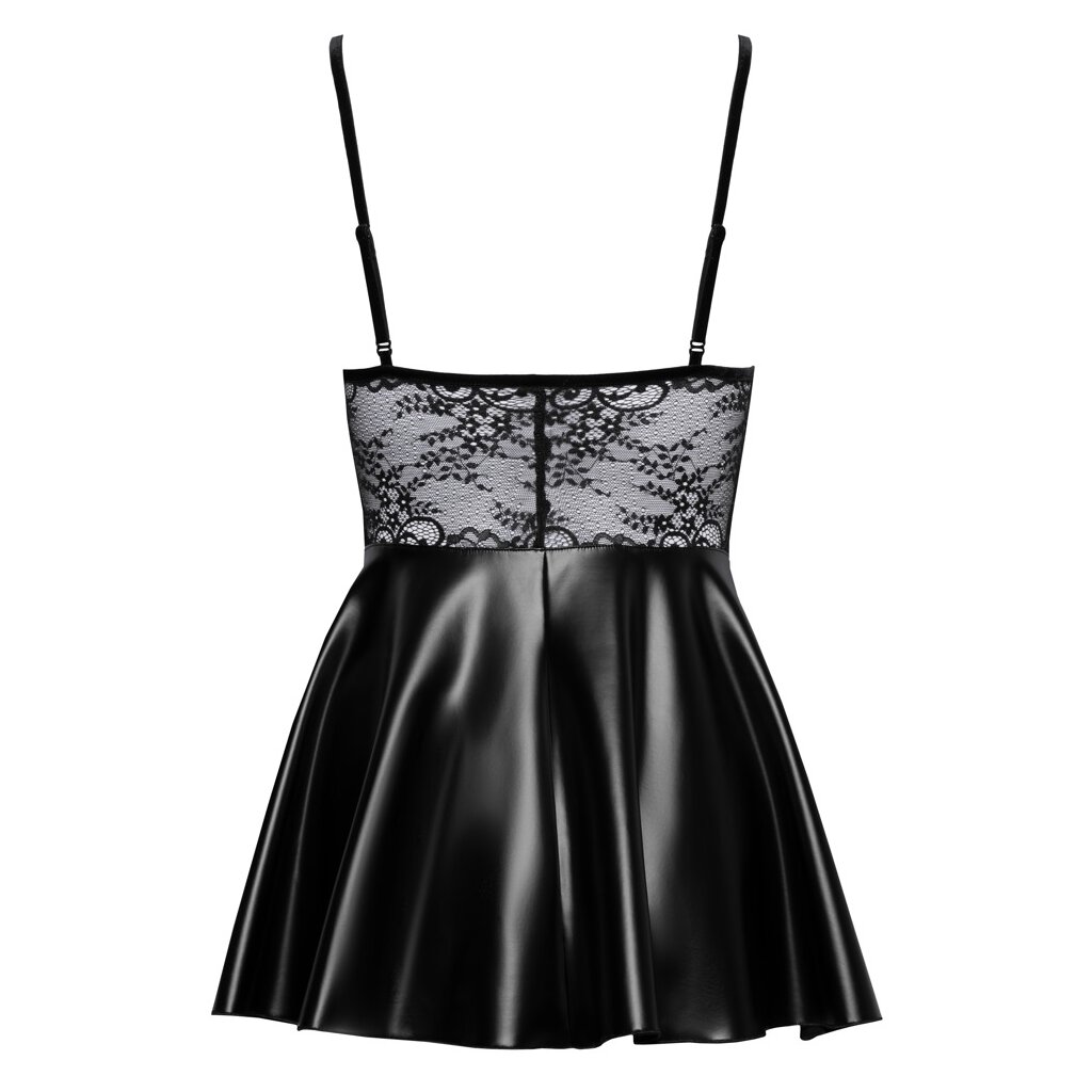 Short dress by Noir made of delicate lace (top) in a mix with powerwetlook (skirt part). All around soft and elastic for maximum wearing comfort. Skin-tight lace top with underwire cups and front zipper up to the skirt waistband, skirt part swinging flared. The straps are adjustable to fit.