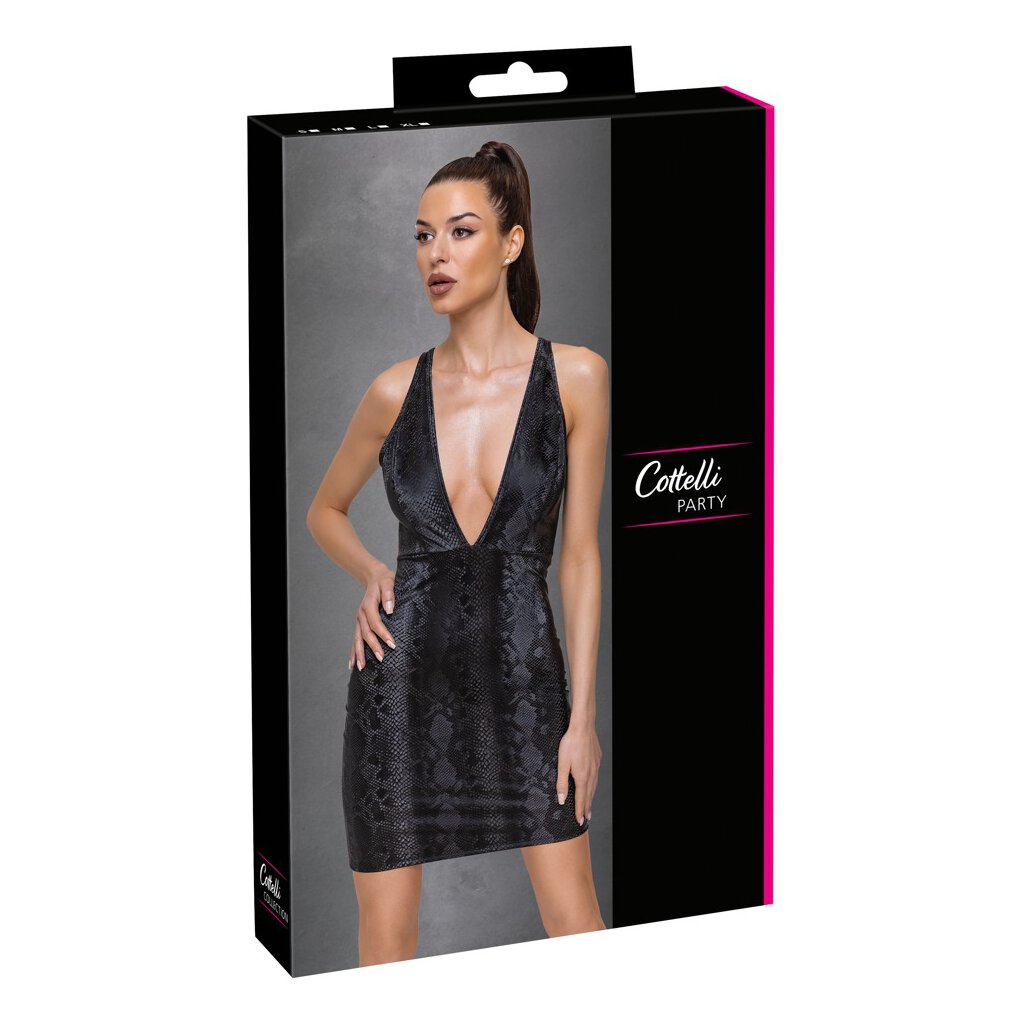 Robe courte tendance de Cottelli PARTY en aspect peau de serpent irisée, brillante et mate. Coupe ajustée à la taille avec un décolleté très profond devant et derrière. Fantastiquement élastique pour une coupe moulante et un grand confort de port.