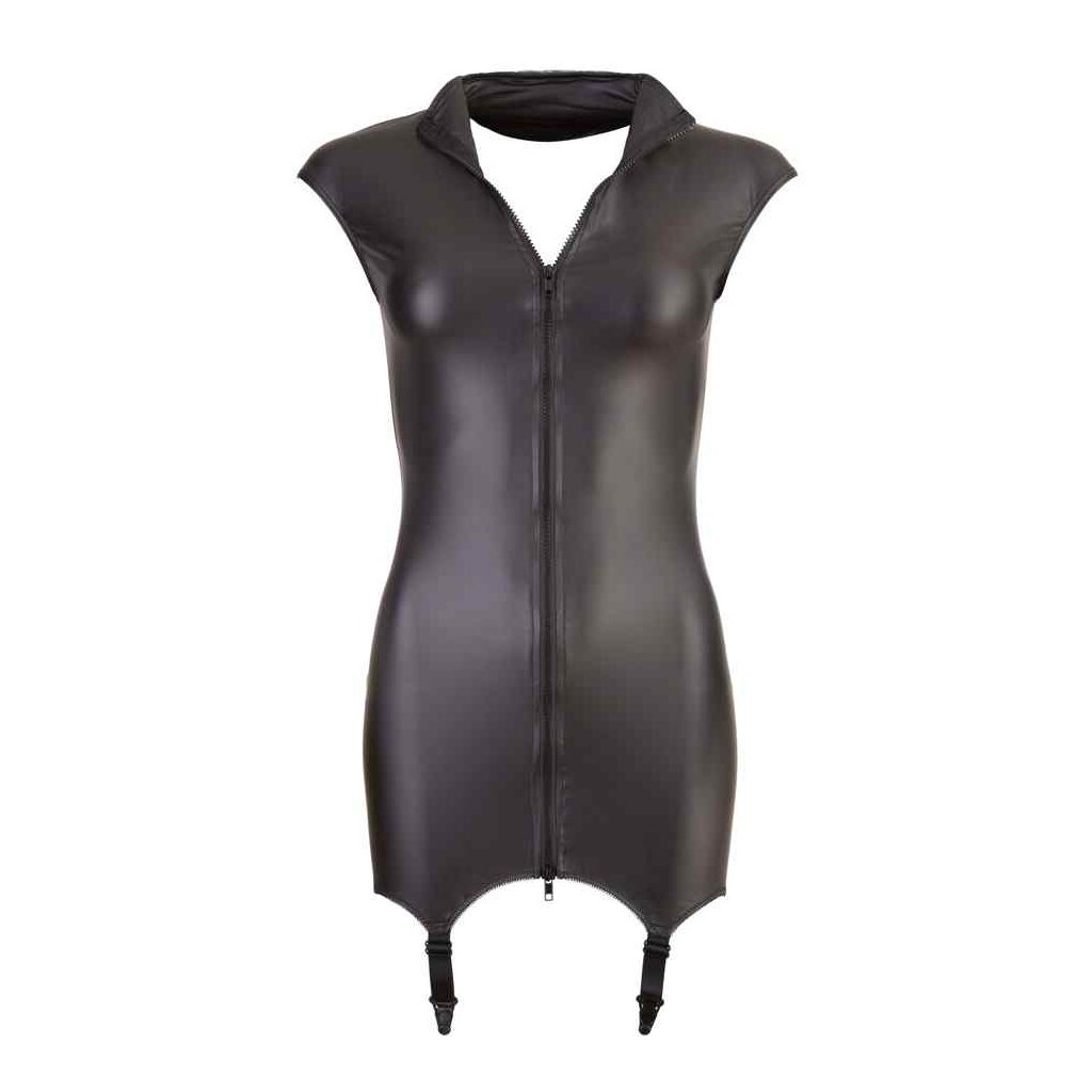 Amusez-vous de toute l'attention que vous recevrez lorsque vous porterez cette robe sexy avec porte-jarretelles. La mini robe sans manches à col montant est fabriquée en matière brillante et mate et dispose d'une fermeture éclair à double sens sur le devant et de quatre porte-jarretelles cousus. Noir. 90% polyester, 10% spandex.