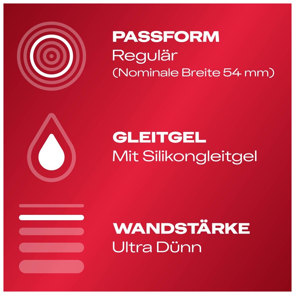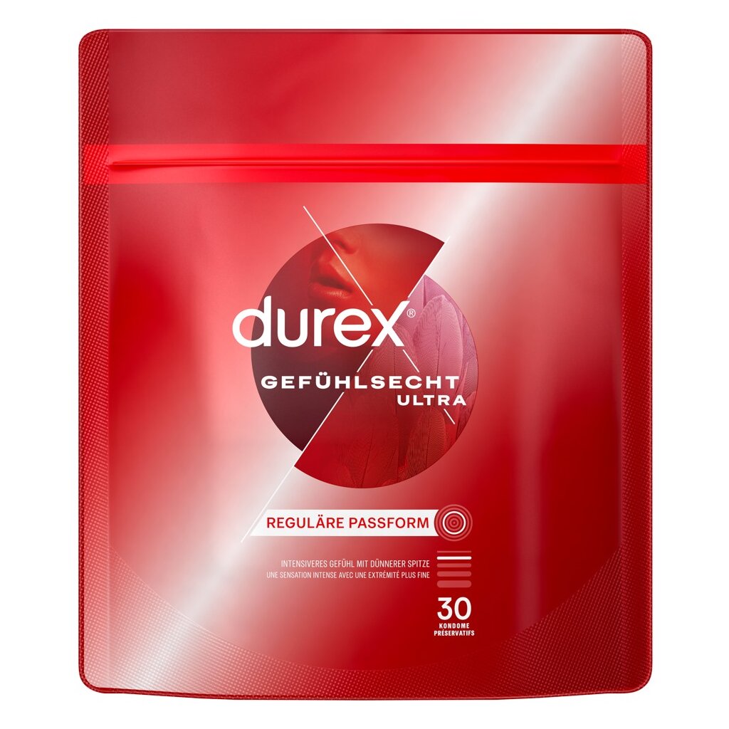 Durex Gefühlsecht Préservatifs ultra transparents en latex de caoutchouc naturel, avec un matériau 20% plus fin à l'extrémité pour des sensations encore plus intenses. Avec réservoir et lubrifiant à base de silicone. Longueur 205 mm, largeur nominale 52 mm.