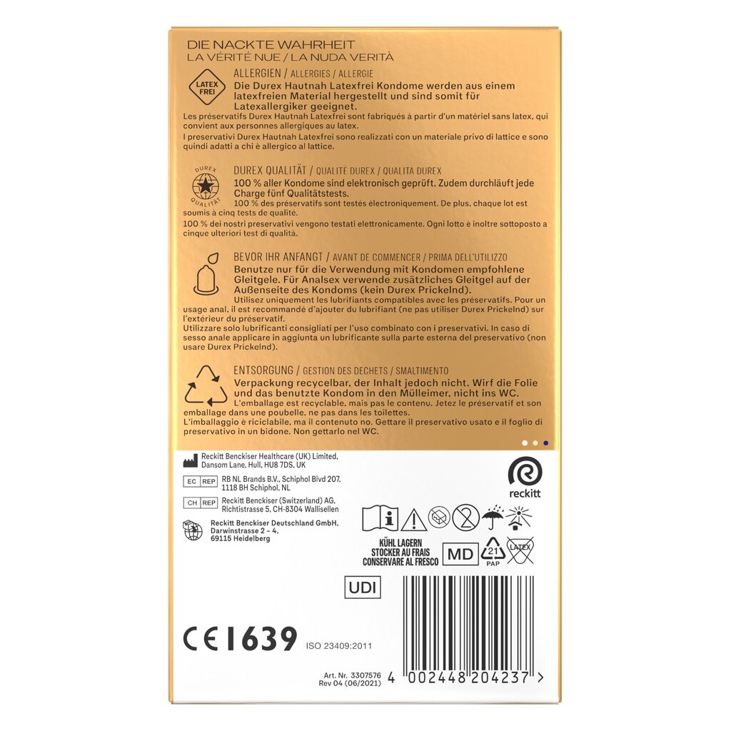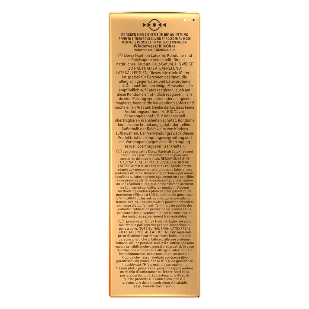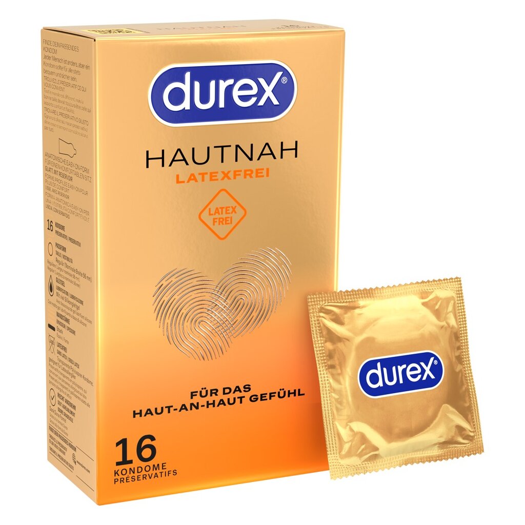 Transparent condoms Skin-on-skin Latex-free from Durex, made from polyisoprene for an intense, natural skin-on-skin feeling. Moisturized with plenty of silicone lubricant.