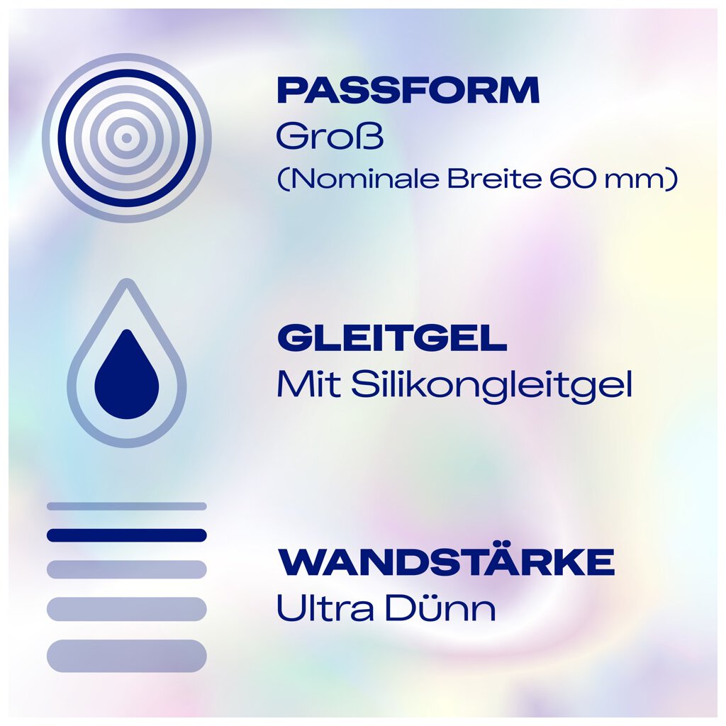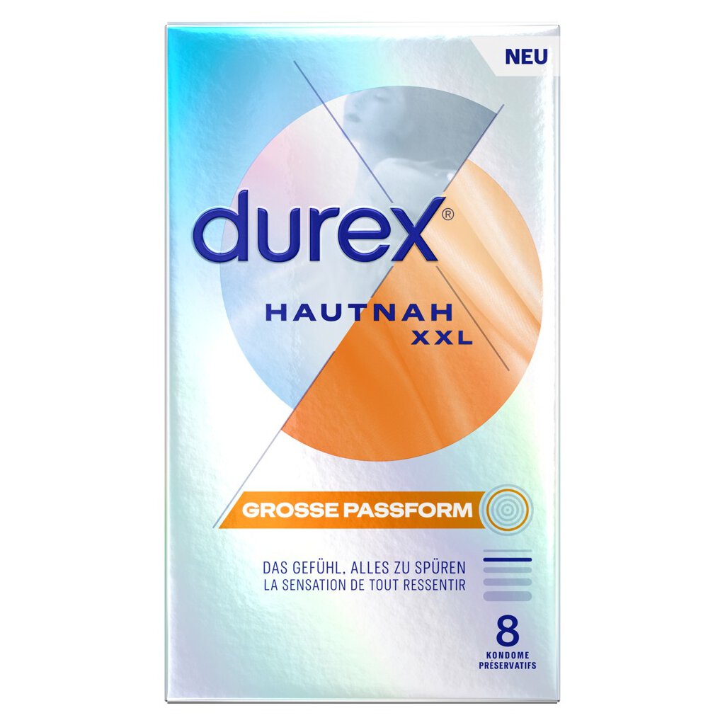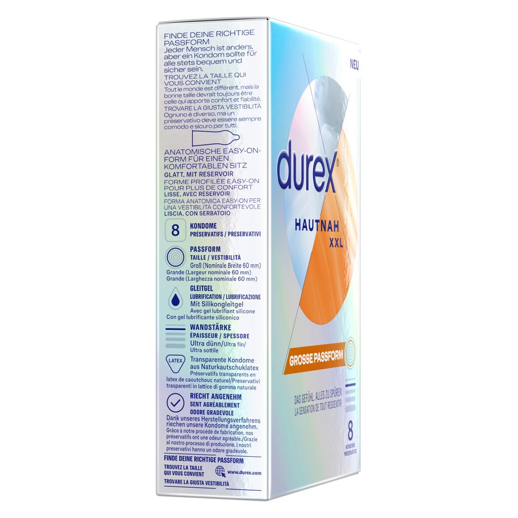 Préservatifs en latex naturel transparent Durex Hautnah XXL avec une épaisseur de paroi ultra fine pour une expérience sexuelle particulièrement intense. Grande taille (largeur nominale de 60 mm) pour plus de confort. Humidifié avec un gel lubrifiant à base de silicone. Forme anatomique facile à enfiler avec réservoir.