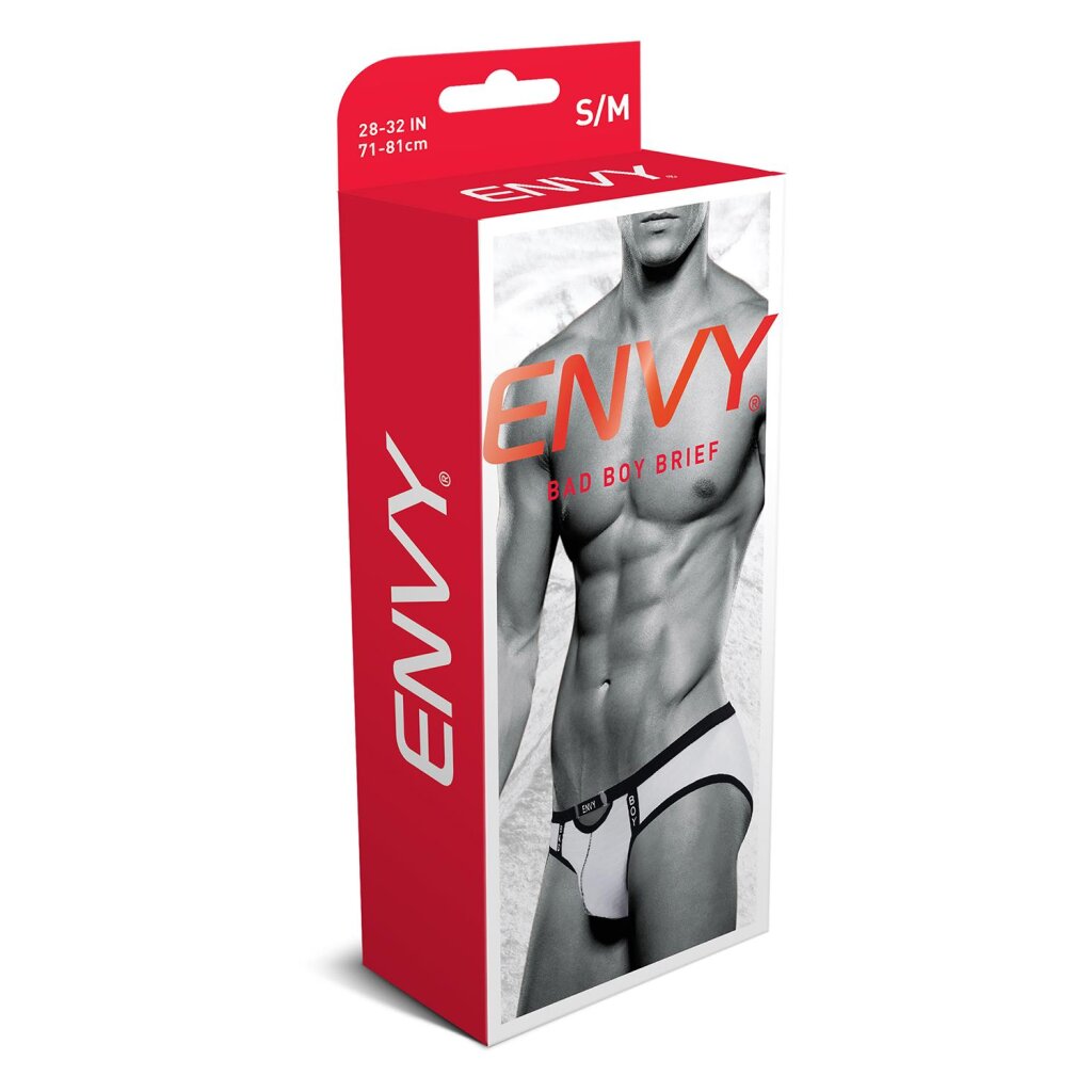 Dieser klassisch geschnittene Slip hat schwarze Besätze, eine niedrige Leibhöhe und einen vollen Rücken, während der Look mit einem Schlüssellochausschnitt auf der Vorderseite, auf dem das ENVY-Logo prangt, und BAD BOY vertikal auf jeder Hüfte für Spaß sorgt... damit du dein wahres böses Ich zeigen kannst! Größe S/M / Materialzusammensetzung: 90% Nylon, 10% Elasthan