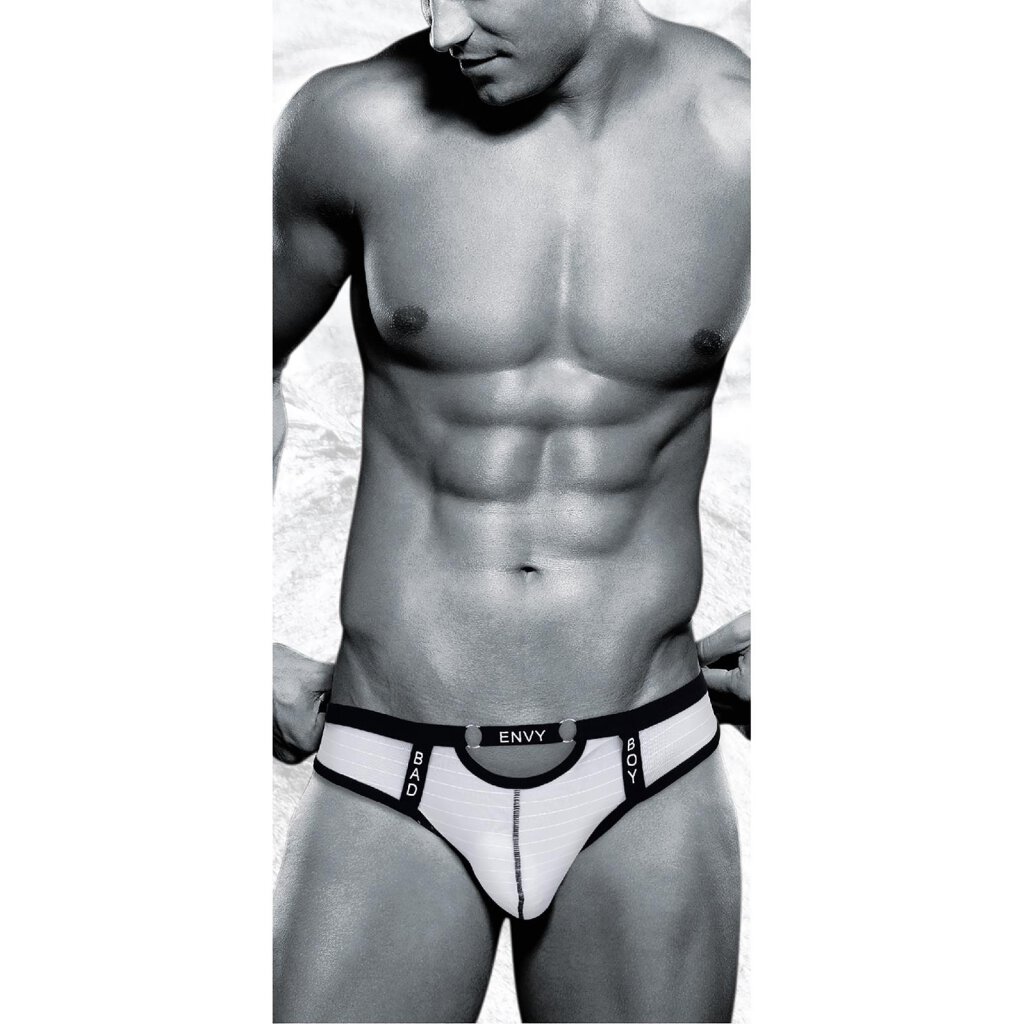 This thong brief has black trim, a low waist and a higher cut back. ENVY is playful with a keyhole cut-out on the front and the popular logo placed across it. Bad Boy, placed vertically on each hip, keeps you on your toes! Size S/M / Material composition: 90% nylon, 10% spandex