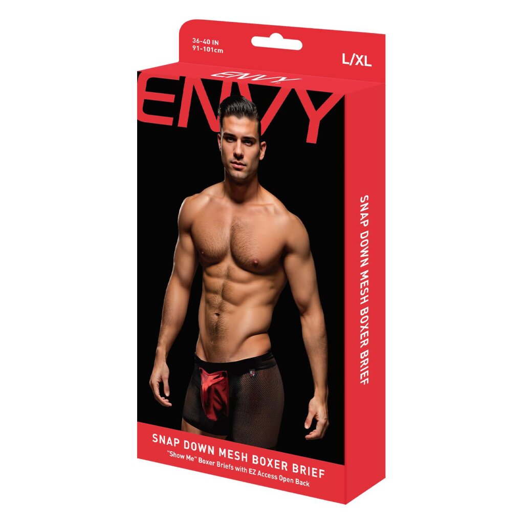 Made from breathable mesh fabric, the boxer shorts have a provocative and seductive design with an open back that adds a touch of sensuality. The key feature is a bright red pouch adorned with two strategically placed poppers, allowing a tantalizing glimpse of what lies beneath. This innovative design not only provides a playful and tantalizing experience, but also allows for a customizable level of exposure. The combination of sleek black mesh and the eye-catching snaps make these boxers a statement for those who prefer a bold and adventurous style in their intimate apparel.