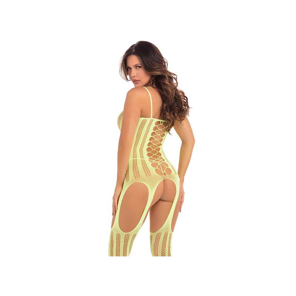 Corsage avec de grandes ouvertures sur le panneau avant et arrière et des ouvertures plus petites sur les panneaux latéraux. Ce bodystocking a des jarretelles intégrées et des bretelles spaghetti. 92% Nylon / 8lasthan