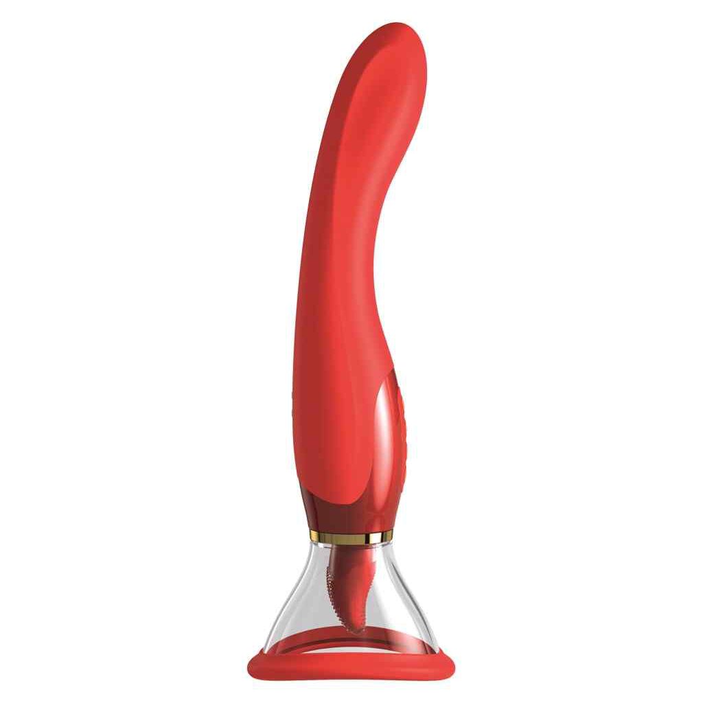 This 3-in-1 vibrator fulfills every desire: the slightly curved shaft reaches the G-spot really easily and stimulates it with its 10 vibration modes. There is a clitoral stimulator with 7 movement modes and a suction cup with 3 suction patterns at the other end. A vacuum can be created at the push of a button. There is also a vacuum release function that guarantees safe fun. The suction cup is removable and all the functions can be controlled separately. Waterproof for safe satisfaction in the bath and the shower. Includes a USB cable and a storage bag.