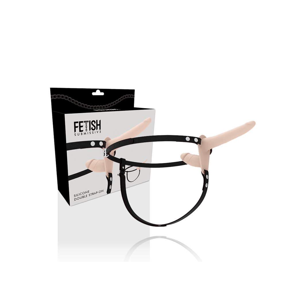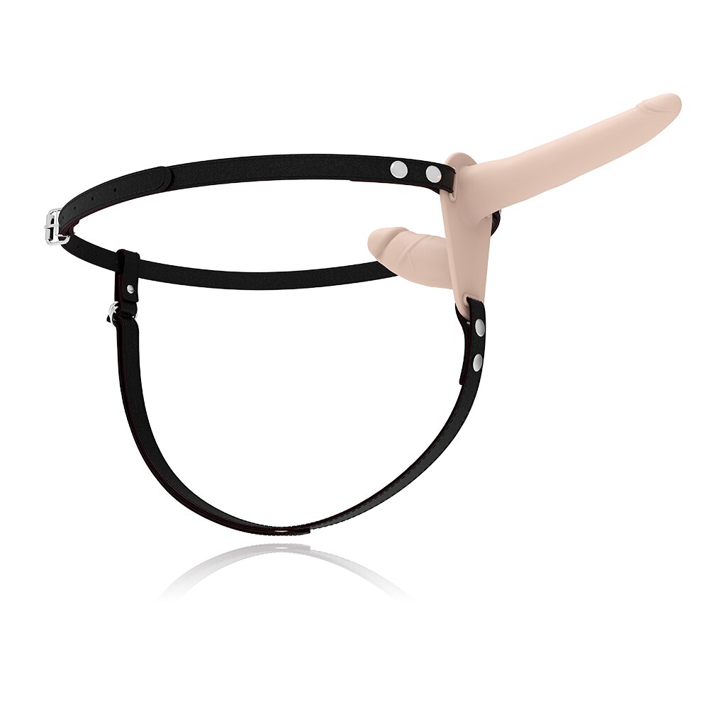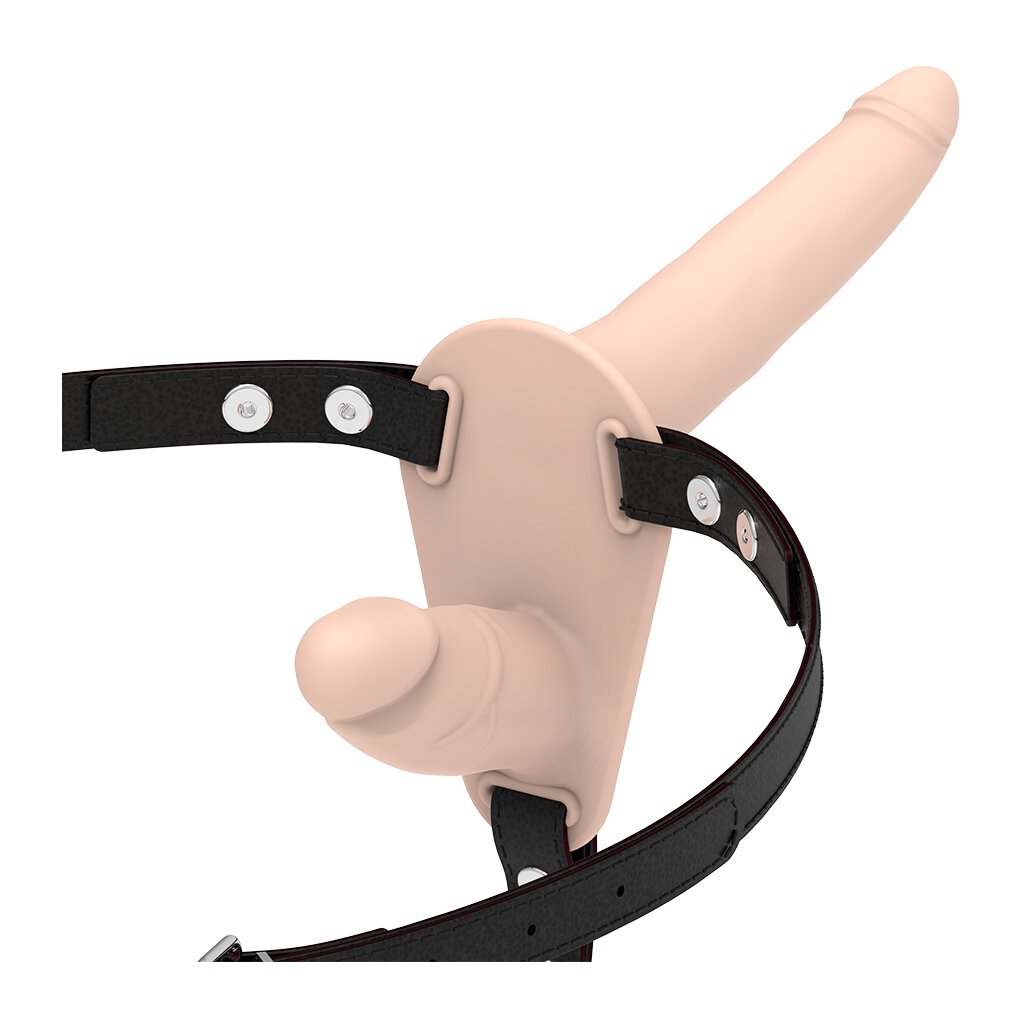 Doppelpenetrationsgurt, anpassbar an jede Hüftgröße, auch an die größten. Der Dildo besteht aus hochwertigem Silikon. Das zertifizierte hypoallergene medizinische Silikon zeichnet sich durch seine seidige Haptik und hervorragende Gleitfähigkeit aus. Damit du lange Freude an deinem neuen Freund hast, empfiehlt es sich, bei deinen nassesten Spielen ein Gleitmittel auf Wasserbasis zu verwenden. So schonst du das Material und die Oberfläche bleibt seidig. Für eine gründlichere Hygiene verwende außerdem einen speziellen Desinfektionsreiniger für Sexspielzeuge. Gesamtlänge von 15 cm beim großen Dildo, 8 cm Länge beim kleinen Dildo / Hergestellt aus Silikon