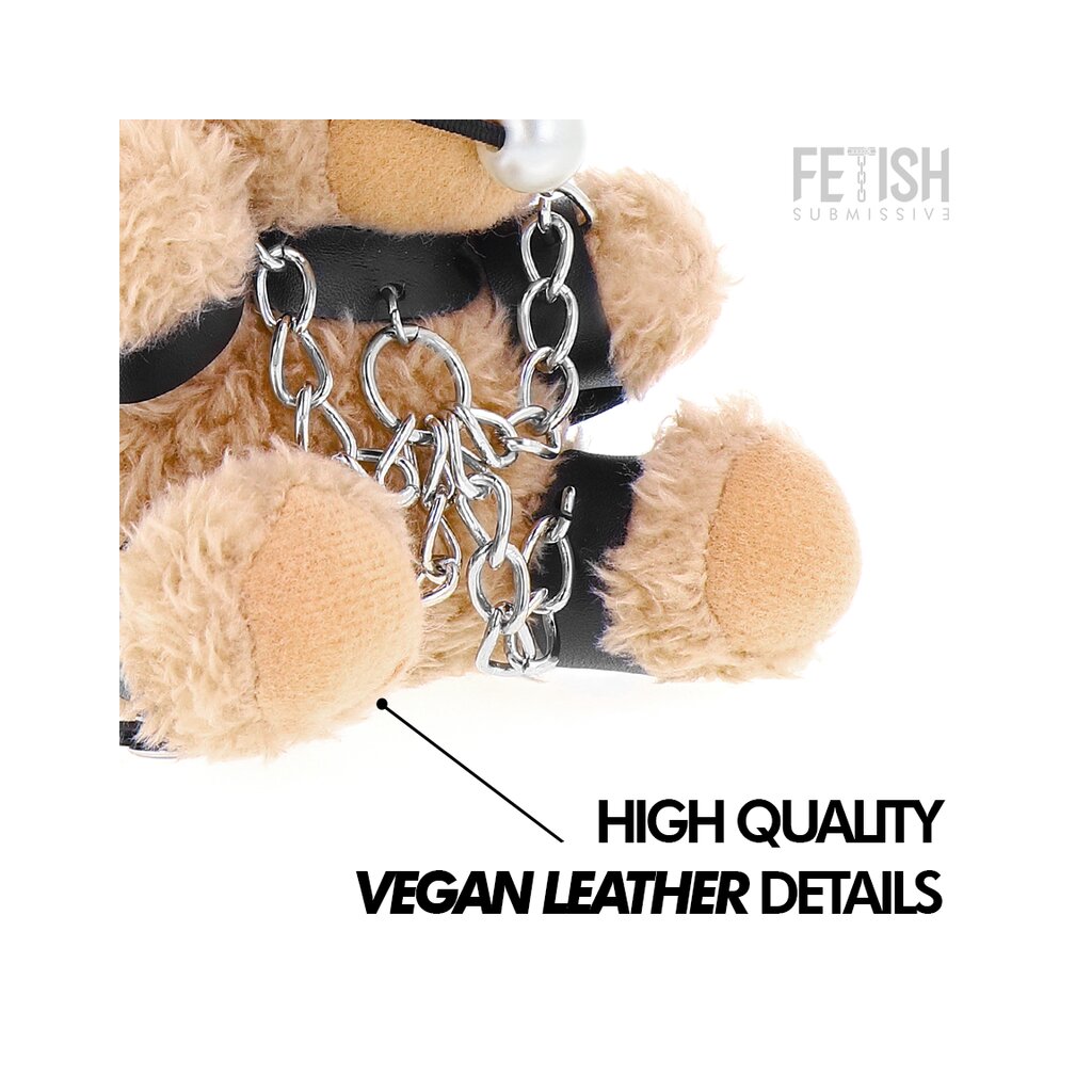 Each teddy bear is made of high-quality materials and has a look that ranges from sweet to rebellious. The details and accessories reflect a provocative style that combines cuteness and boldness. The harnesses are made of soft leather and lace ribbons and perfectly fit their petite figures. They wear masks that cover part of their face, giving them a mysterious and charming look. The colorful gags give them a cheeky and playful touch, while small chains are wrapped around their plush bodies, adding texture and an impressive visual effect.