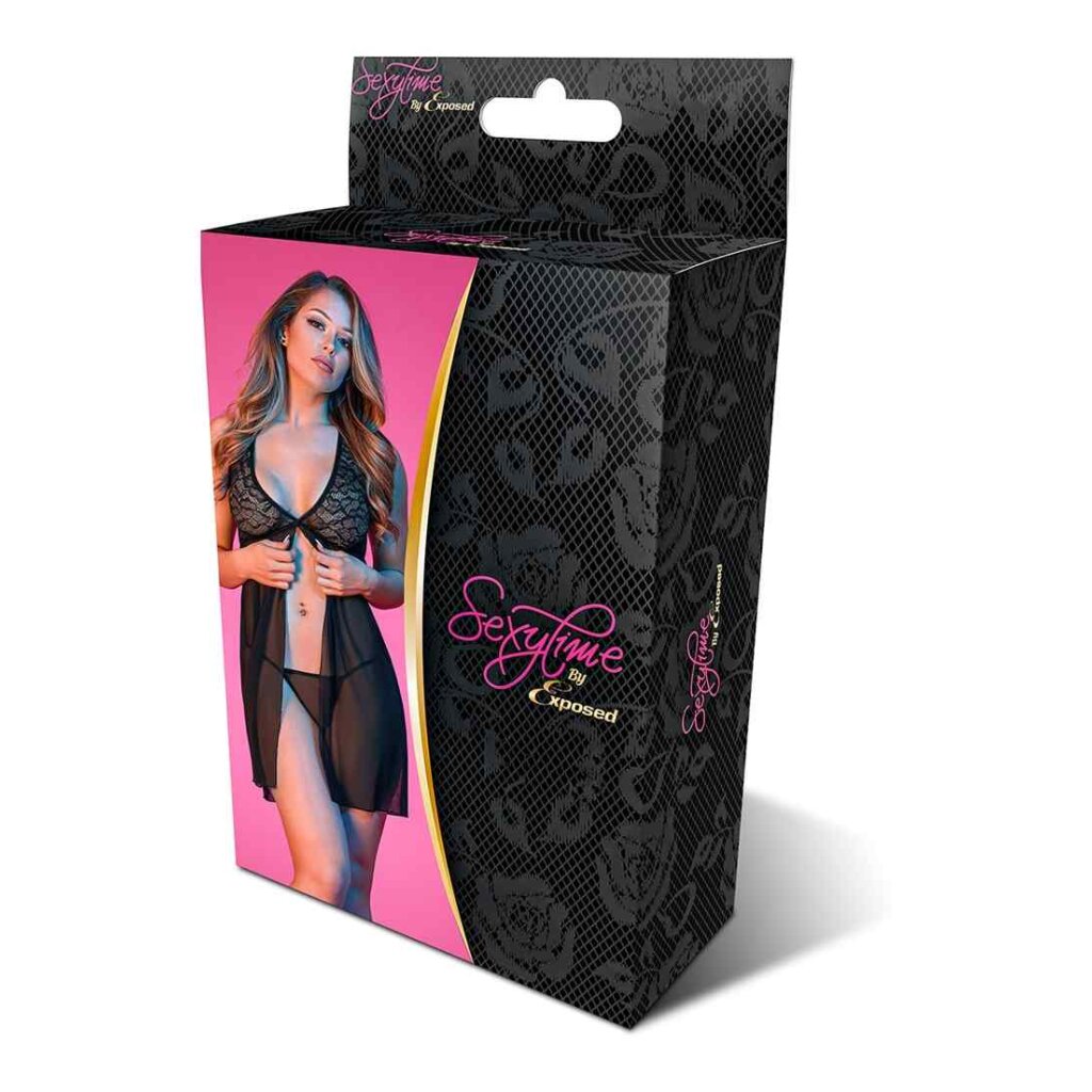 Eine Babydoll mit weichen Spitzen-BH-Körbchen, einem Rücken aus Spitze im Panzer-Stil, einer Öffnung zum Wegfliegen, einer langen Oberschenkellänge und einem klassischen Netzstring.