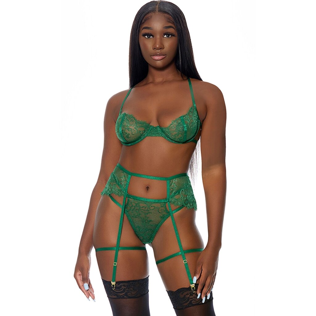 Décliné dans un vert séduisant, cet ensemble de lingerie déploie toute sa splendeur.
