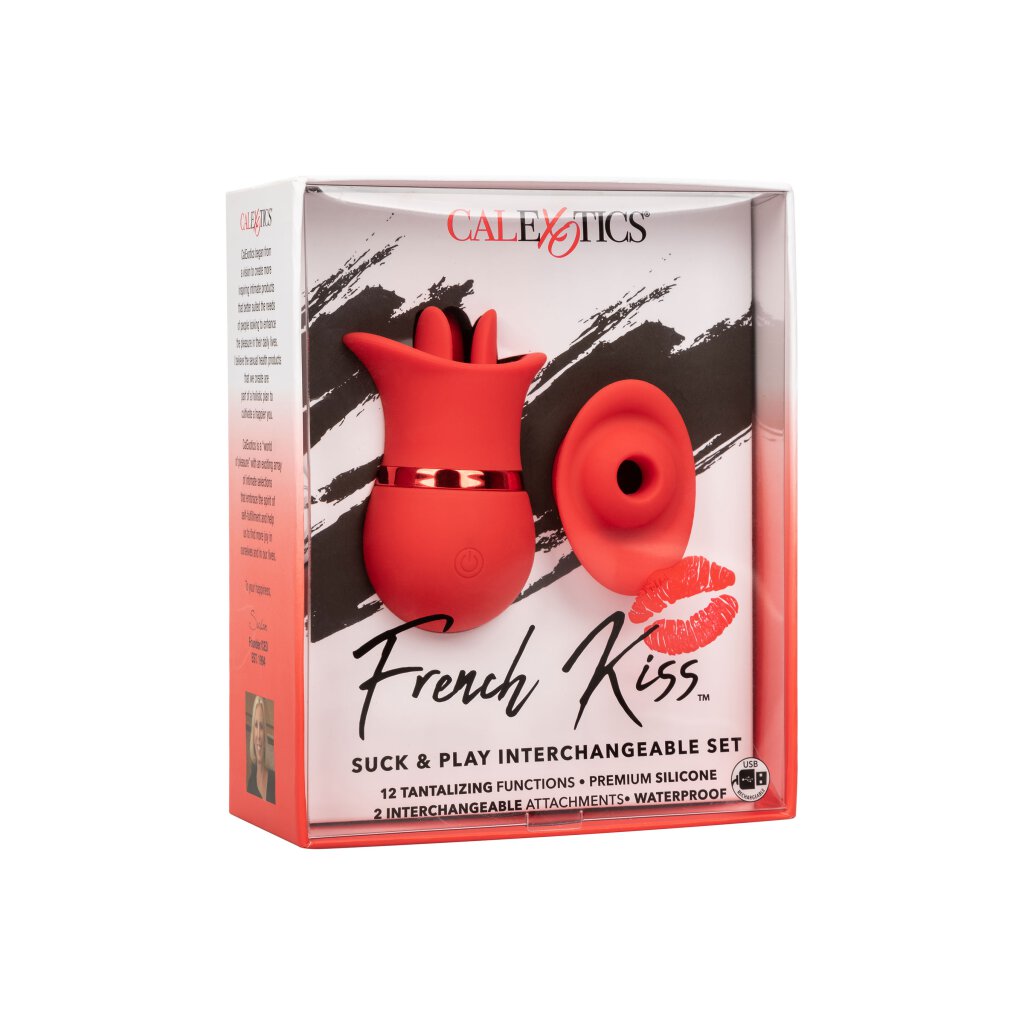 Double the pleasure, oh la la! The sensual French Kiss Suck & Play Interchangeable Set knows exactly what you need: 2 interchangeable attachments with 12 vibration functions or 12 suction functions. The full contact attachment and the fluttery triple tongue stimulation attachment are designed to perfectly match your most intimate pleasure points with 12 intense functions. Swap out the sensually shaped sleeve and enjoy 12 functions of arousing suction, or indulge in a real tongue kiss with 12 functions of fluttering action. The soft, cuddly silicone and sensually shaped body provide pinpoint pleasure from almost any angle. Control up to 50 minutes of pleasure with the easy-touch button. Charge your pleasure in just 1 hour with the included USB cable in the massager's self-sealing charging port. The mini massager's discreet size and travel lock button make it the perfect travel companion to enjoy wherever your fantasies take you. Product dimensions: 5 x 3.75cm (Arouser) | 8.25 x 4.5cm (total) / 12 vibration modes / 12 speed modes / Waterproof / Material: Silicone (Stimulator) ABS with metallic coating (Decor) / Rechargeable