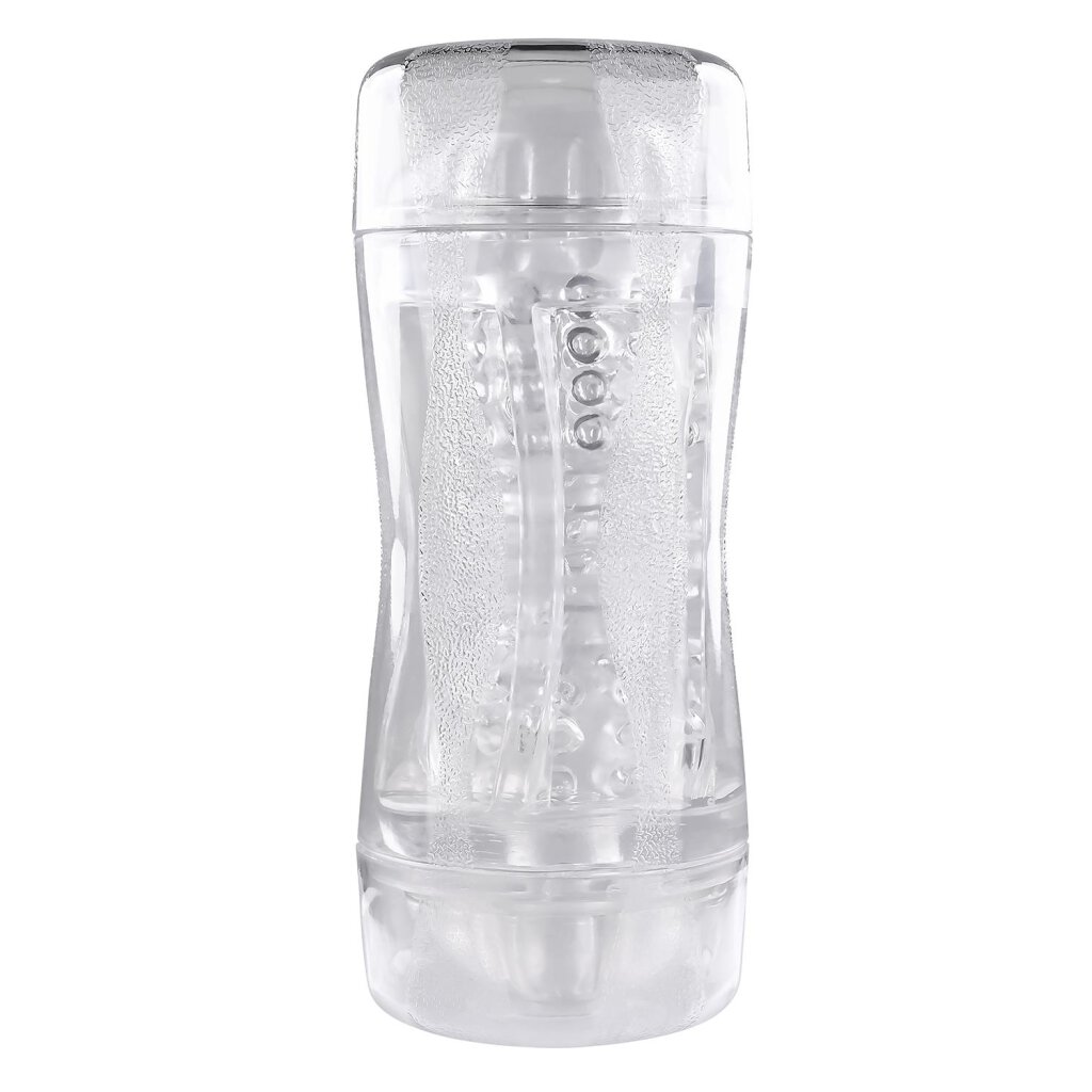 Allow the pleasure possibilities to unfold with this unique dual-ended stroker that’s beautifully transparent for an erotic see-through experience. Two separate entries with varying sizes (one tight, one loose) lets you choose your adventure inside the circular beaded chamber that’s soft and squishy, yielding yet firm. An included vibrating ring lets you experiment with intense stimulation while you play! The hard plastic exterior canister is textured for an easy grip while caps at both ends ensure safe storage and protection. Sleeve pops out for cleaning.