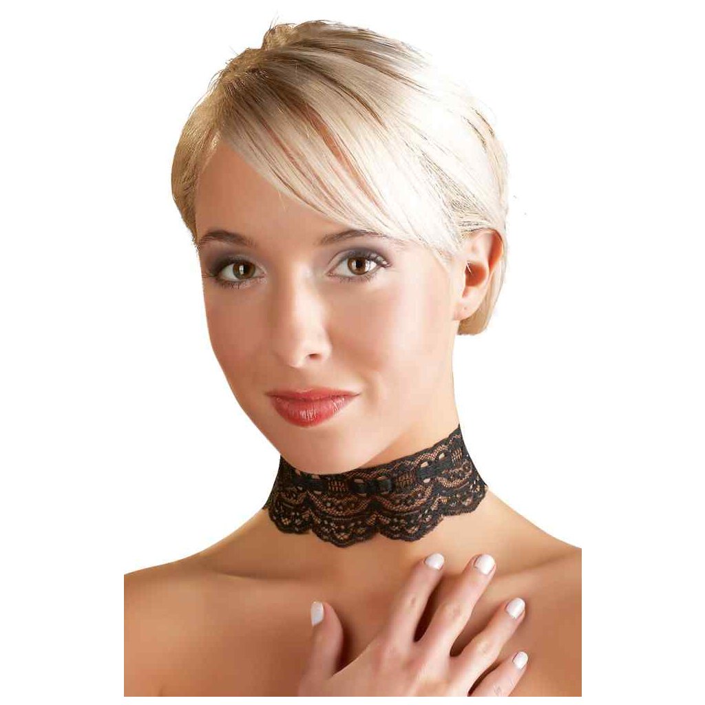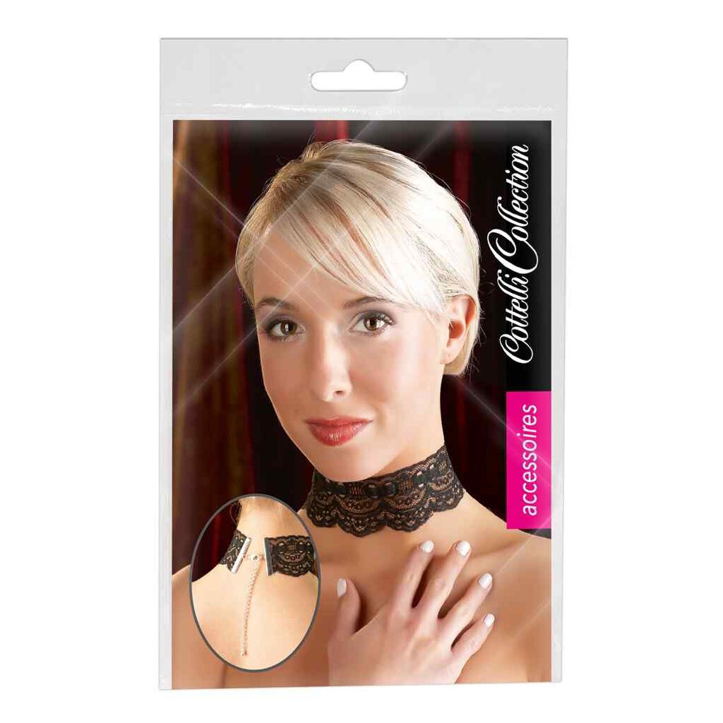 Black lace choker with chains/hook fastener – adjustable. Length approx. 30-45 cm, 5 cm high. 100% polyester.