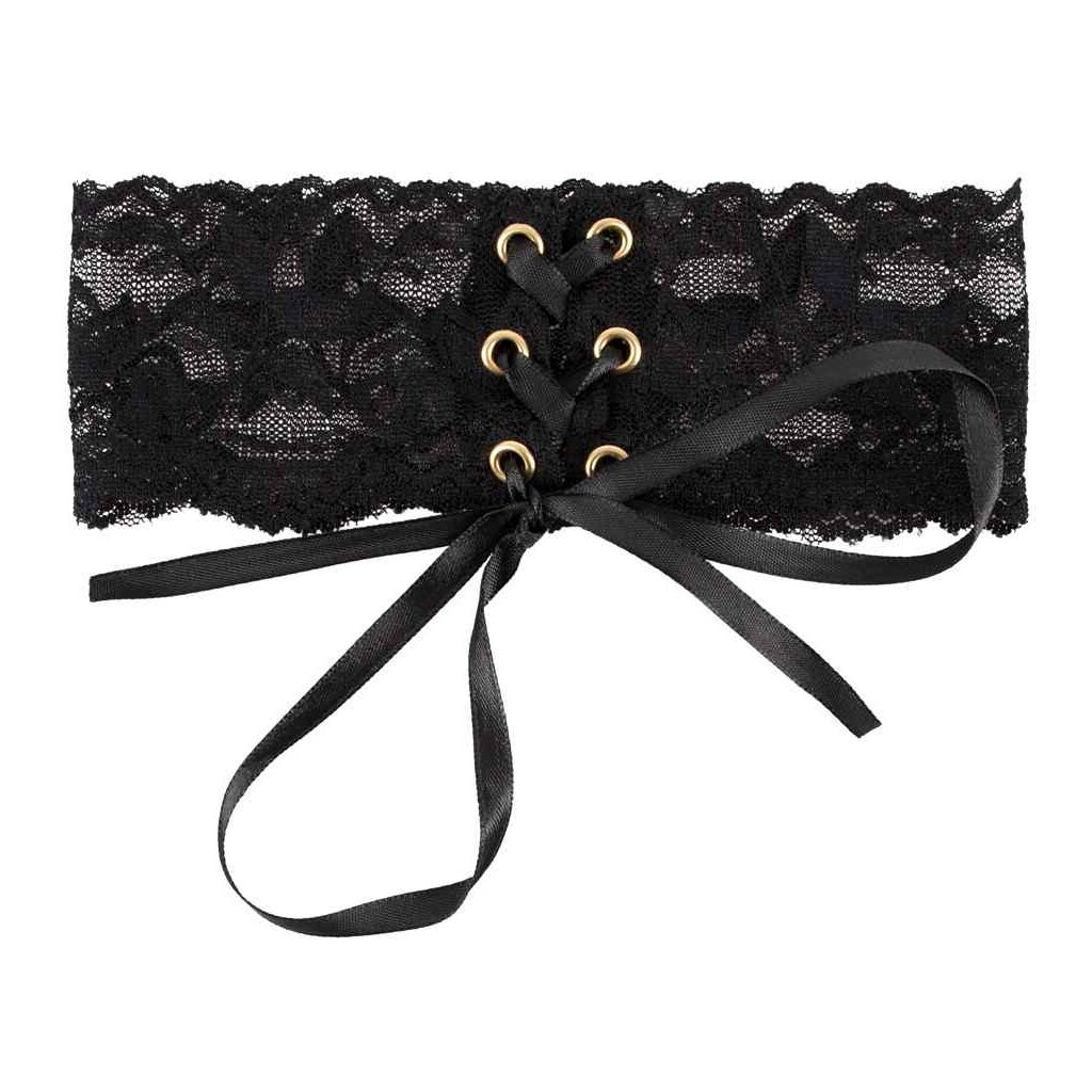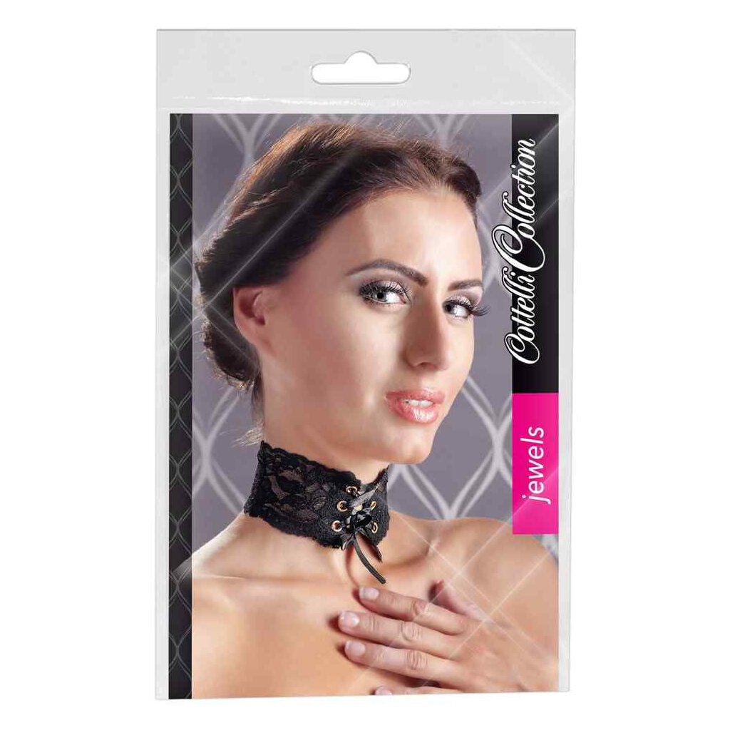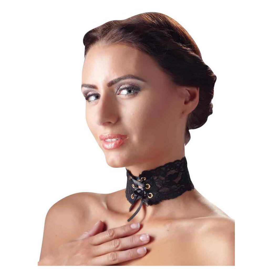 Beautiful choker made of black lace with 6 eyelets and satin lacing to tie the choker together and to adjust the length. Complete length approx. 32 cm, height approx. 6 cm. Material: 100% polyester.