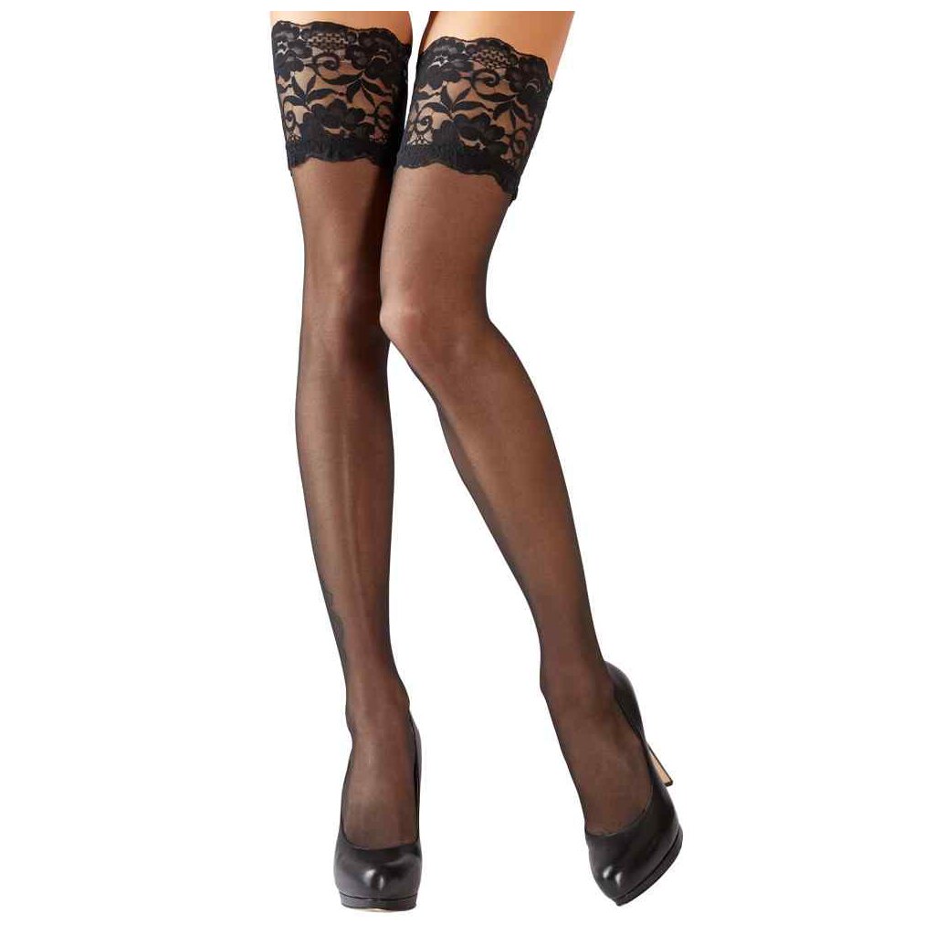 Jarretelles avec une partie supérieure en dentelle de 12 cm de large. Avec une doublure en silicone pour un ajustement antidérapant. 20 deniers.